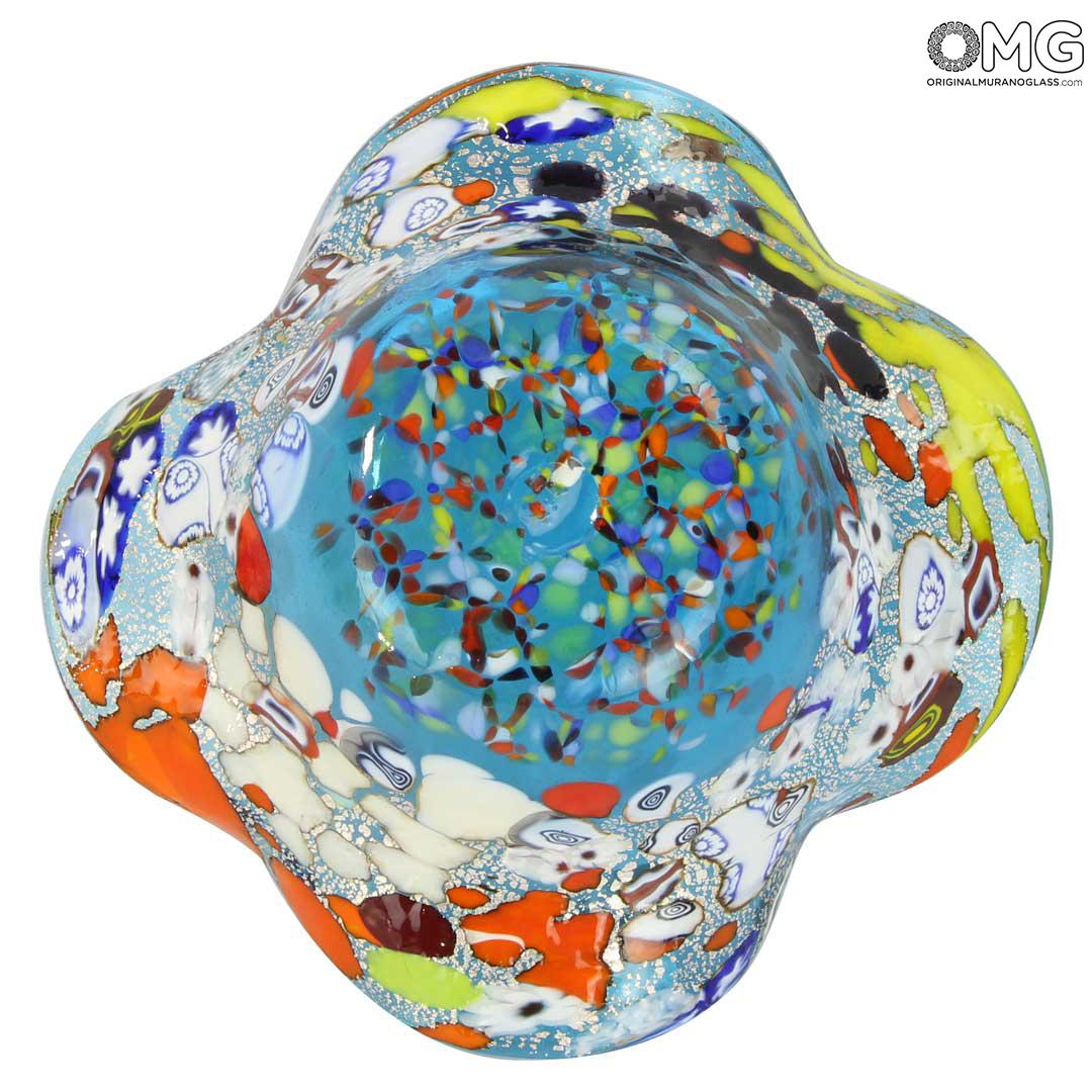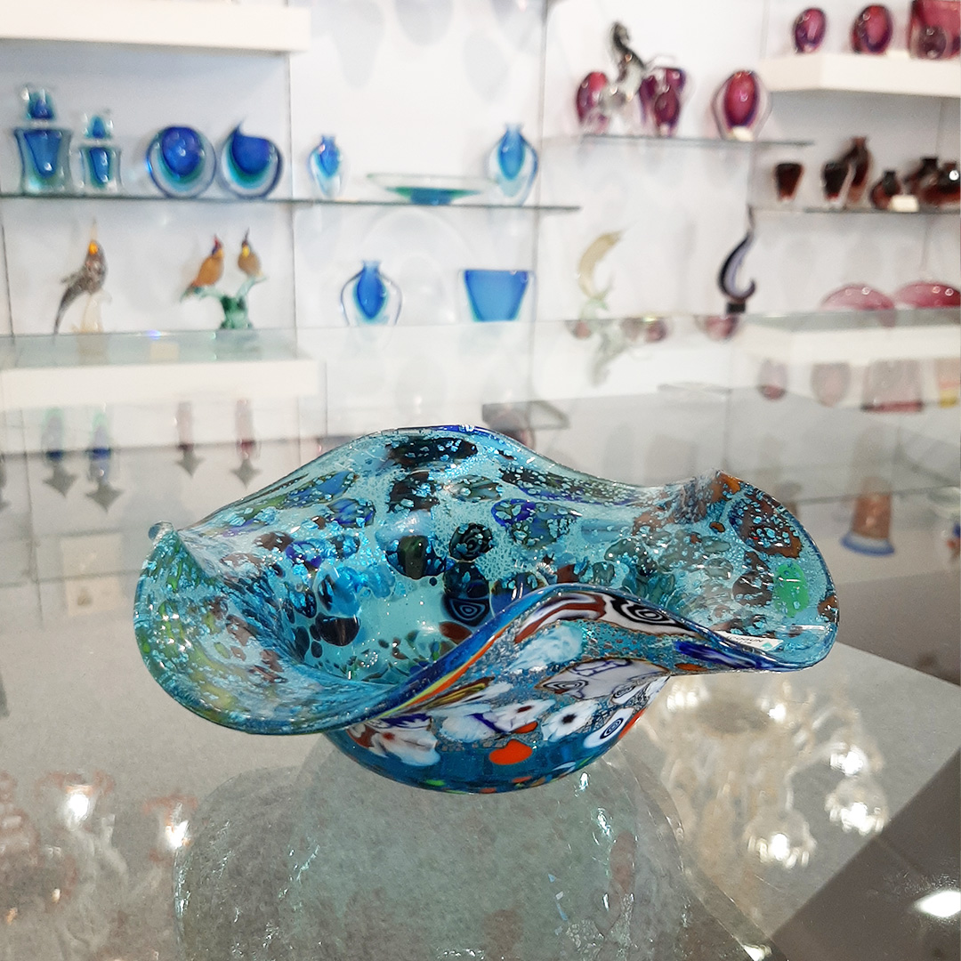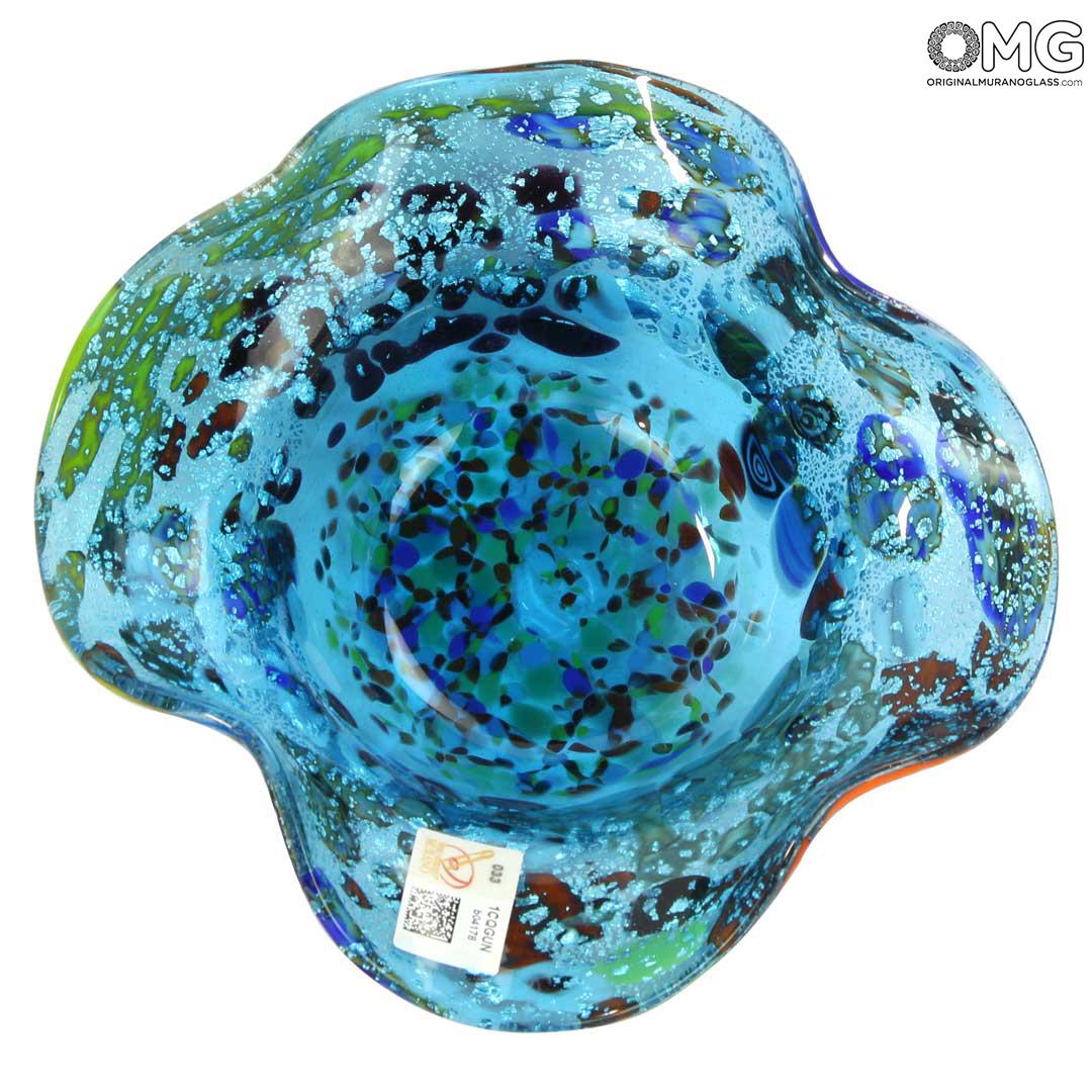 This handcrafted Murano glass bowl is made with the technique of glass blowing and murrina (millefiori) decoration, embellished with silver leaf. The vibrant blend of colors, especially the shades of blue, yellow, and spot of red, creates a mesmerizing effect. The organic, wavy shape adds elegance, while the silver leaf embedded in the glass enhances its brilliance and uniqueness. It's perfect as a decorative centerpiece, catching and reflecting light beautifully. The craftsmanship is outstanding truly a piece of Venetian art that showcases the skill of Murano glassmakers. Highly recommended for art lovers and collectors!