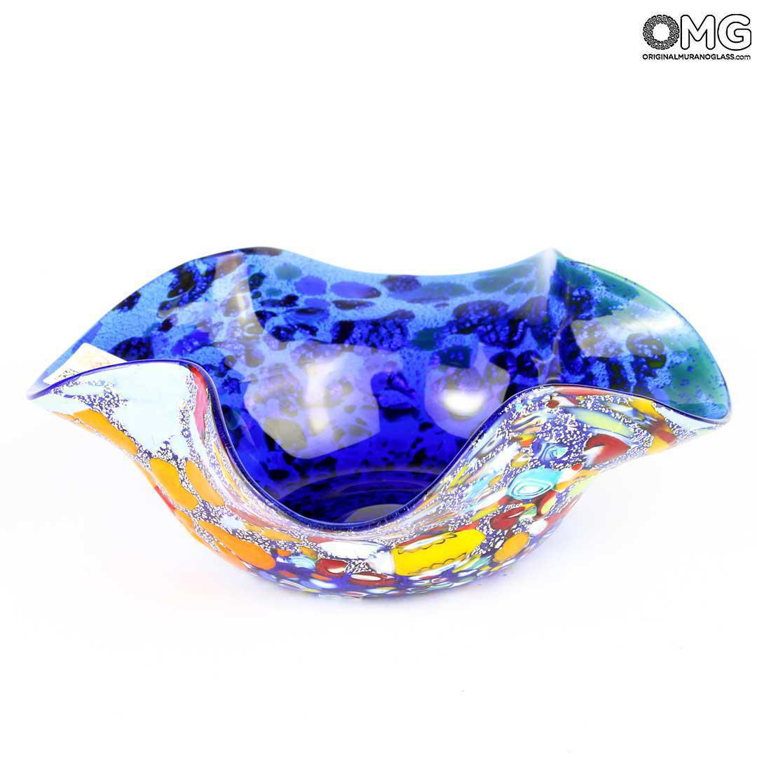 This handcrafted Murano glass bowl is made with the technique of glass blowing and murrina (millefiori) decoration, embellished with silver leaf.The organic, wavy shape adds elegance, while the silver leaf embedded in the glass enhances its brilliance and uniqueness. It's perfect as a decorative centerpiece, catching and reflecting light beautifully. The craftsmanship is outstanding truly a piece of Venetian art that showcases the skill of Murano glassmakers. Highly recommended for art lovers and collectors!