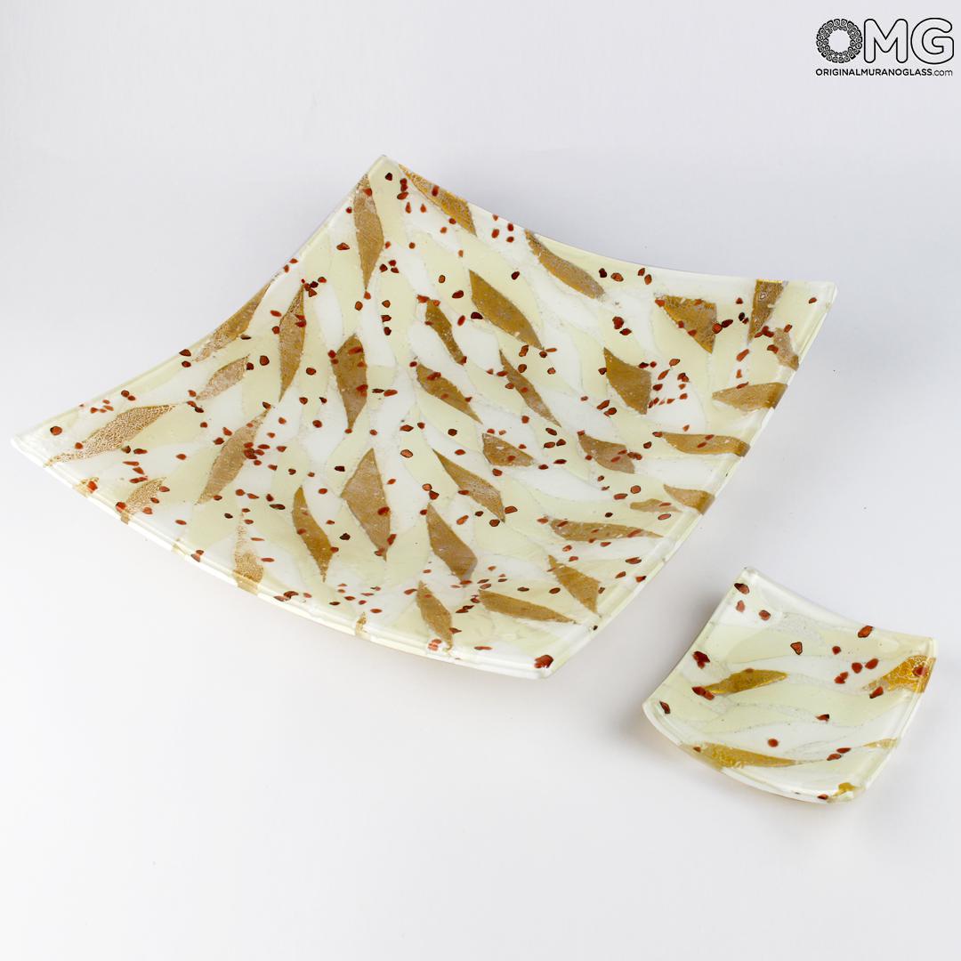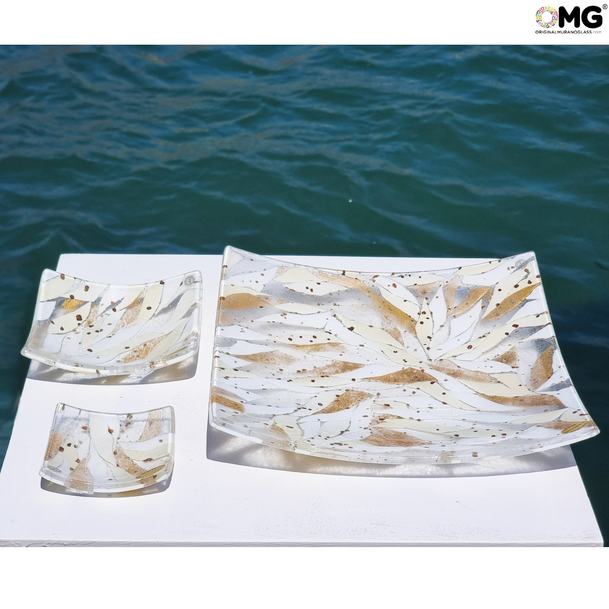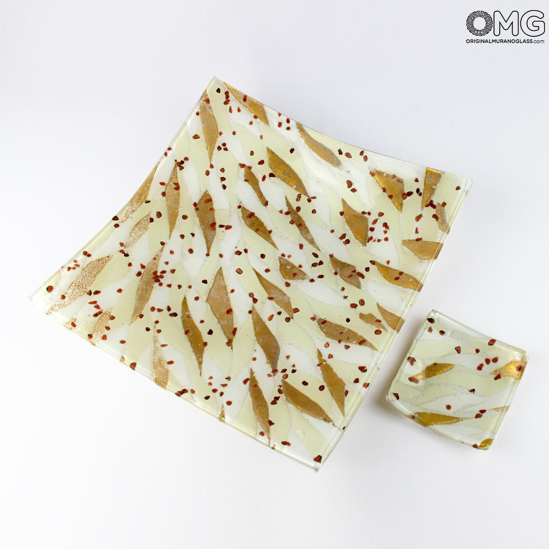 Assiette réalisée selon la technique du fusing, rehaussée d'une précieuse feuille d'or véritable 24 carats. Disponible en plusieurs tailles, la petite version peut servir de pochette ou de cadeau de mariage, tandis que la plus grande peut faire office de centre de table.