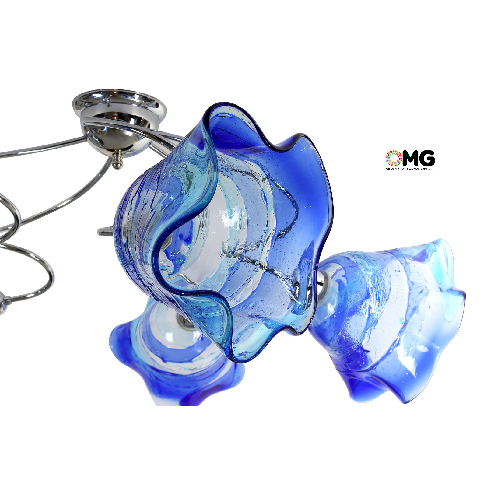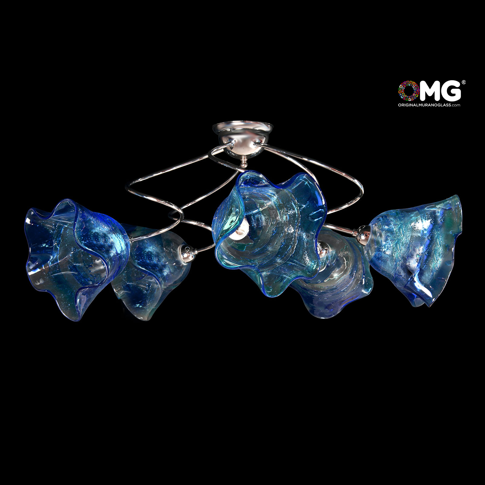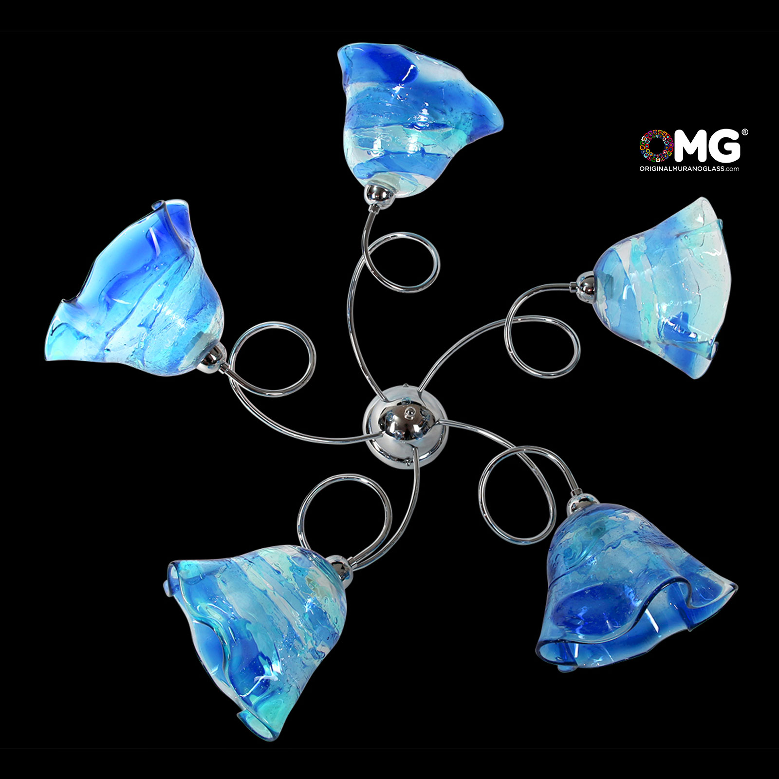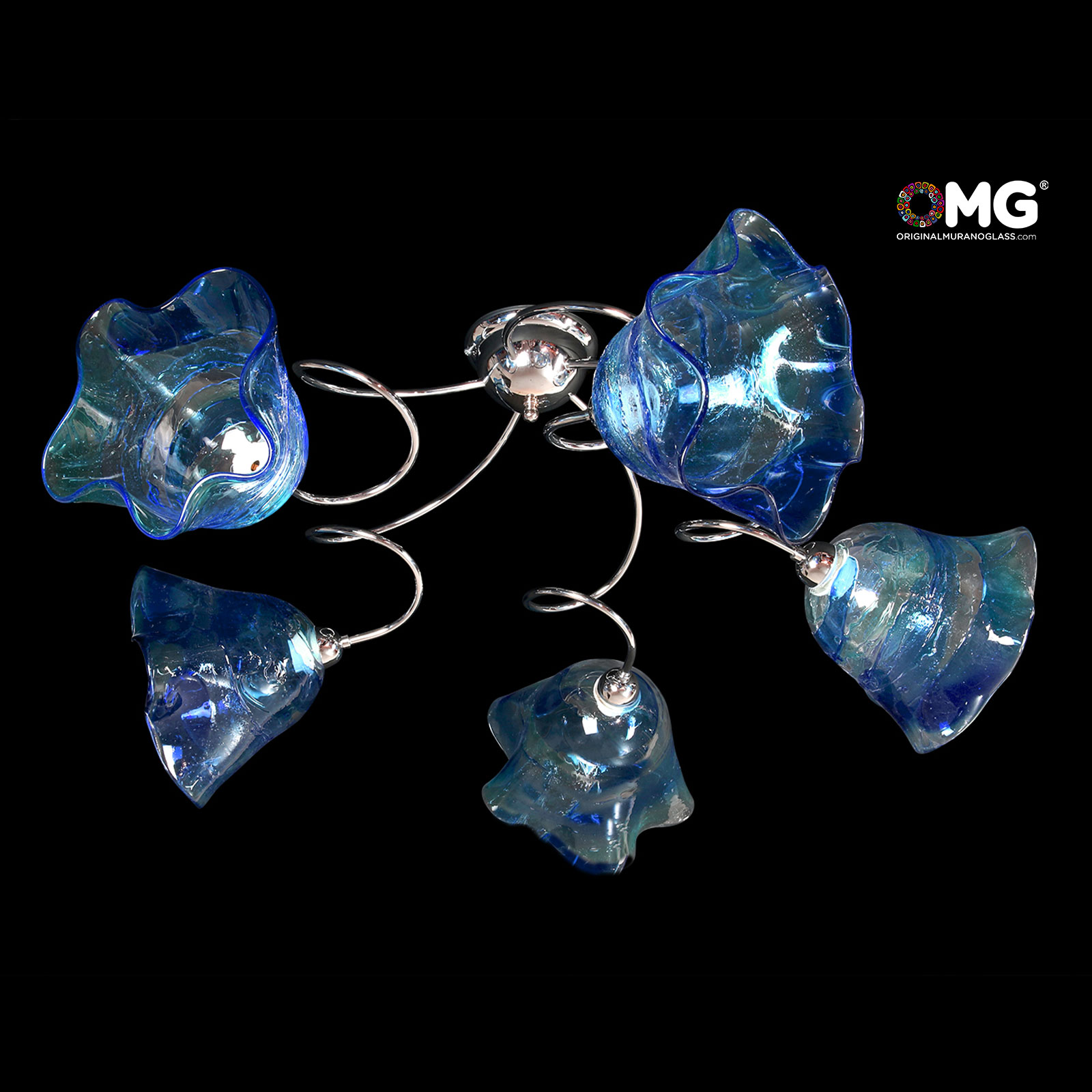 Murano glass ceiling lamp handmade in blowed glass, 5 lights, with nice blue and ligth blue color, very nice effects on surface make it unique. Each cup is handmade and unique