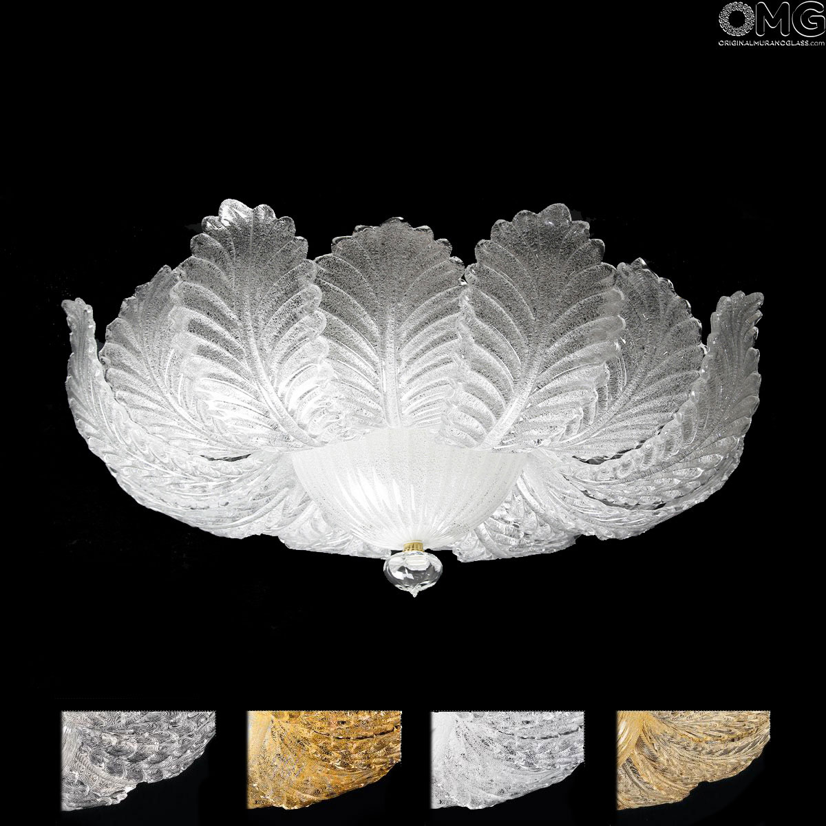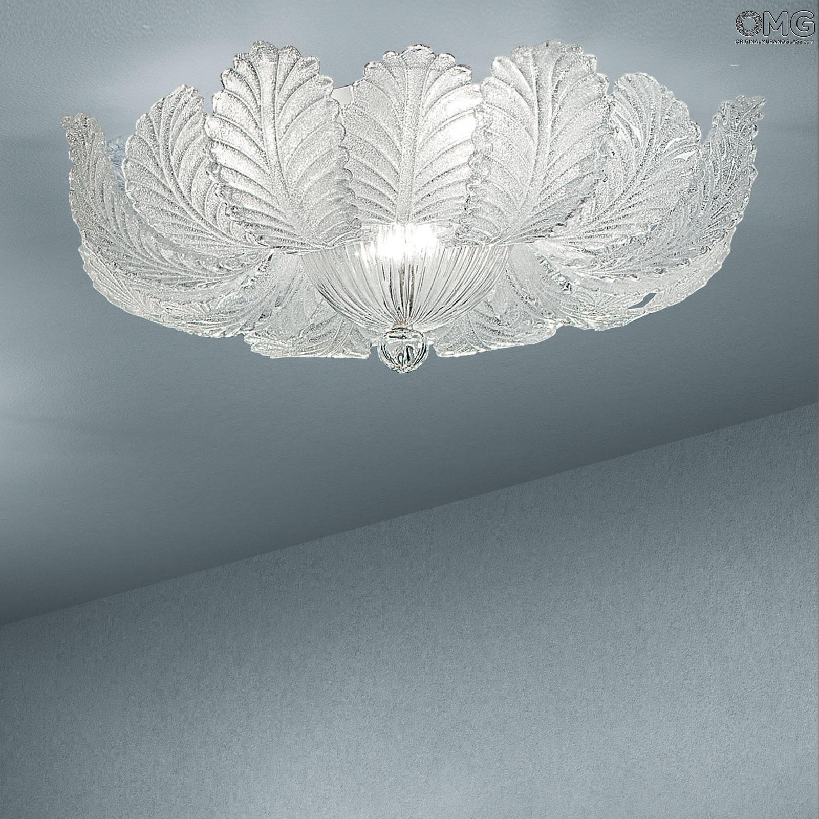 Beautiful original Murano ceiling lamp made by assembling the glass leaves one by one on a central structure.