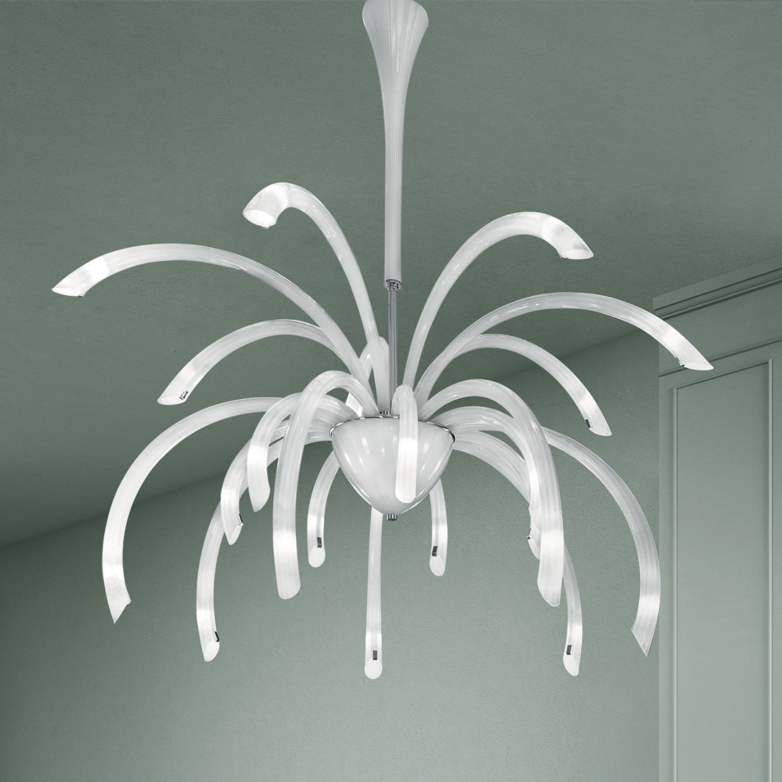 An appealing, functional design with vibrant outlines suited for all types of interiors. The curved, opaque or clear-glass branches extend the from glass-coated metal cups and project the light into various directions, creating an enchanting atmosphere in the room.