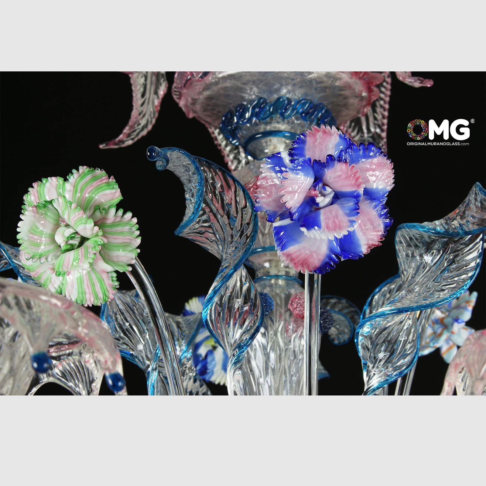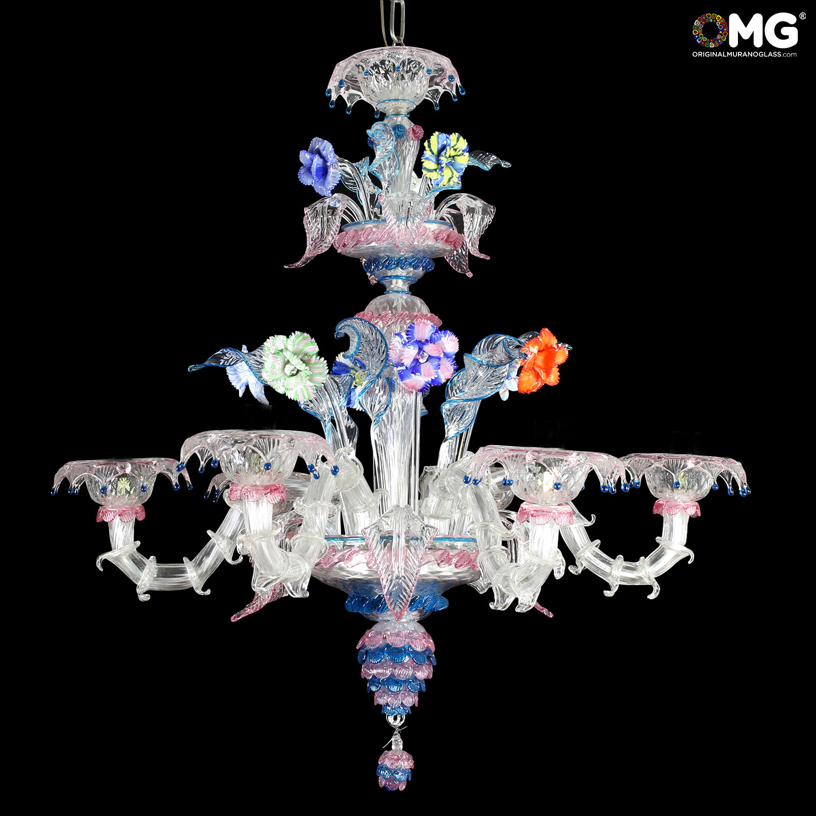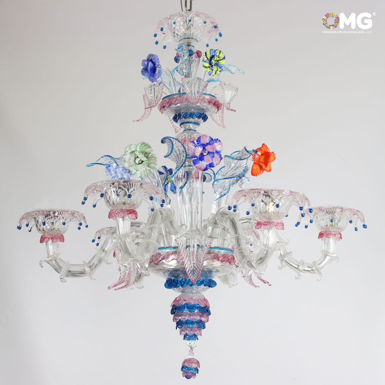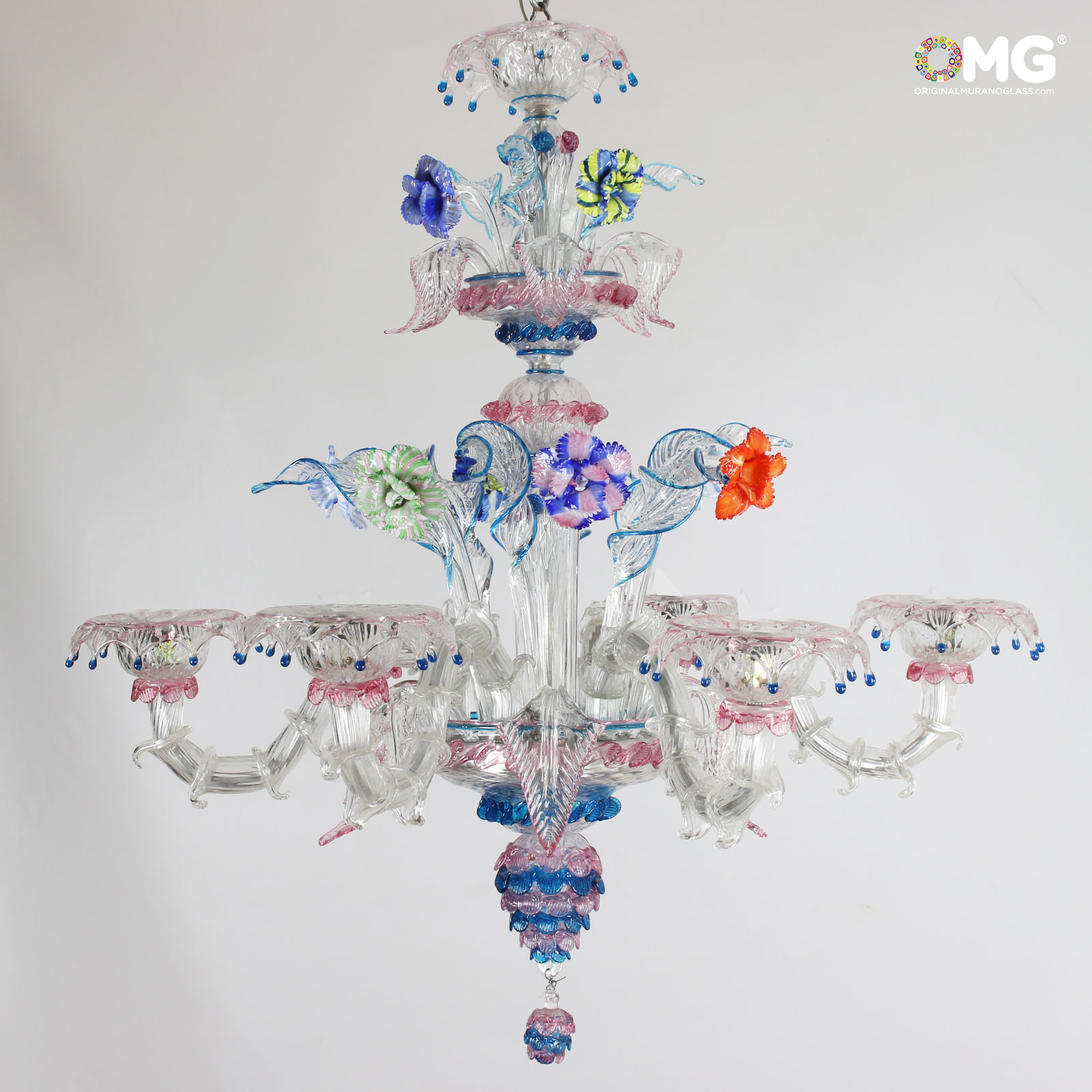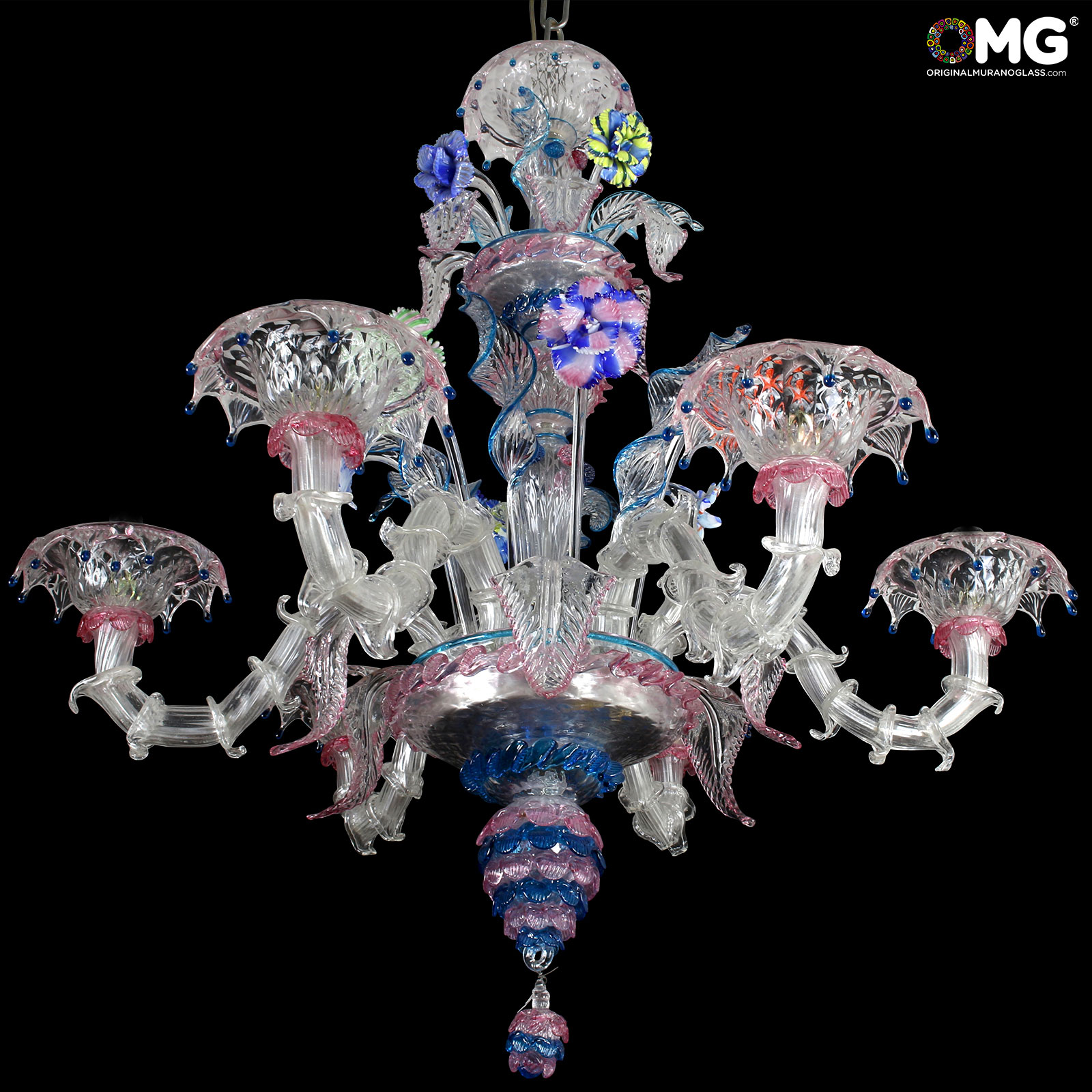 Rezzonico 6 lights artistic glass color Crystal with colorful details. Flowers glass paste blue.