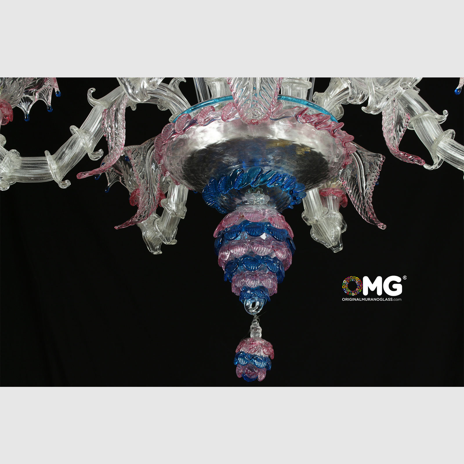 Chandelier handmade according with the old Murano glass tradition, handcrafted in colored glass.