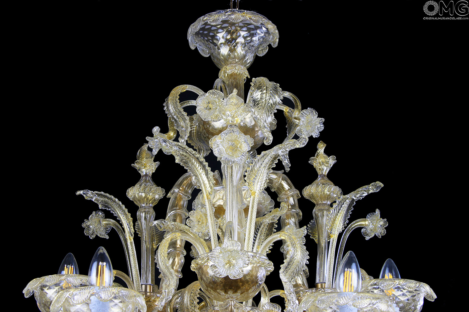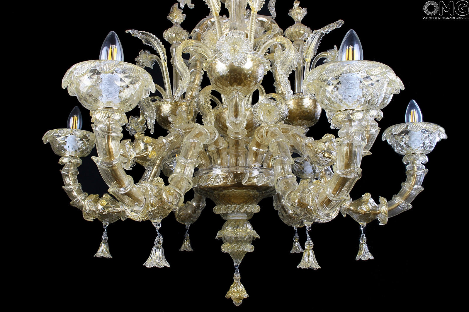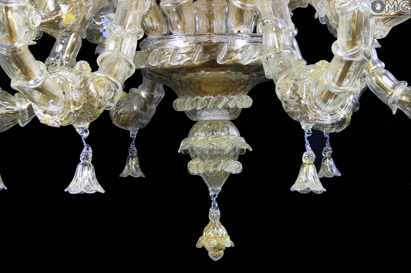 Luxury venetian chandelier handmade in original Murano glass Rezzonico style, blown glass with gold 24 kt in all its parts.