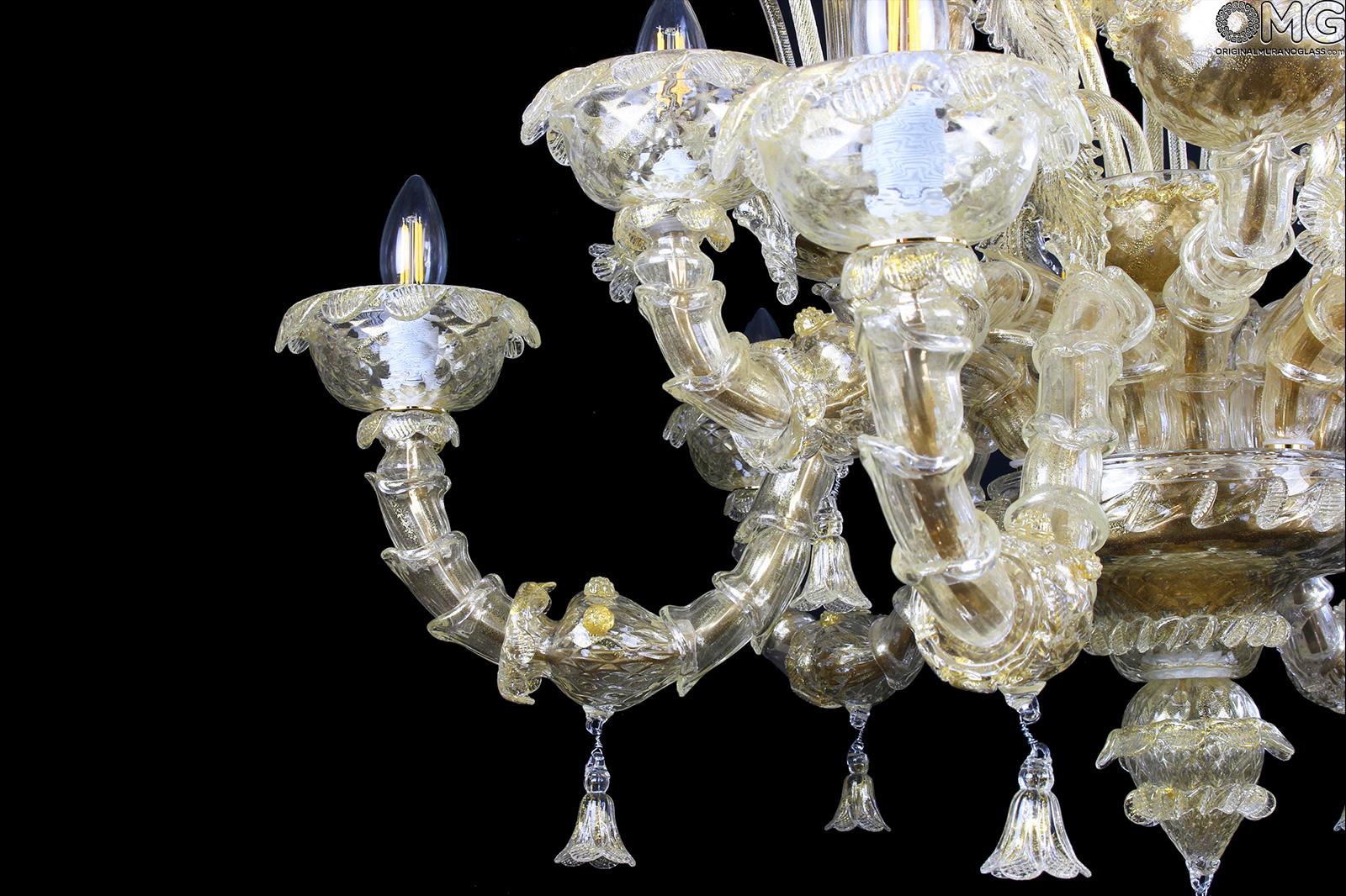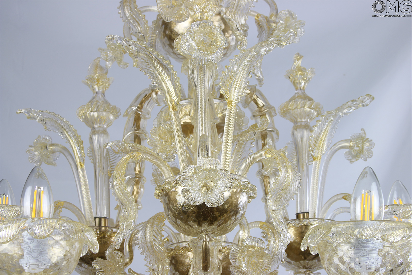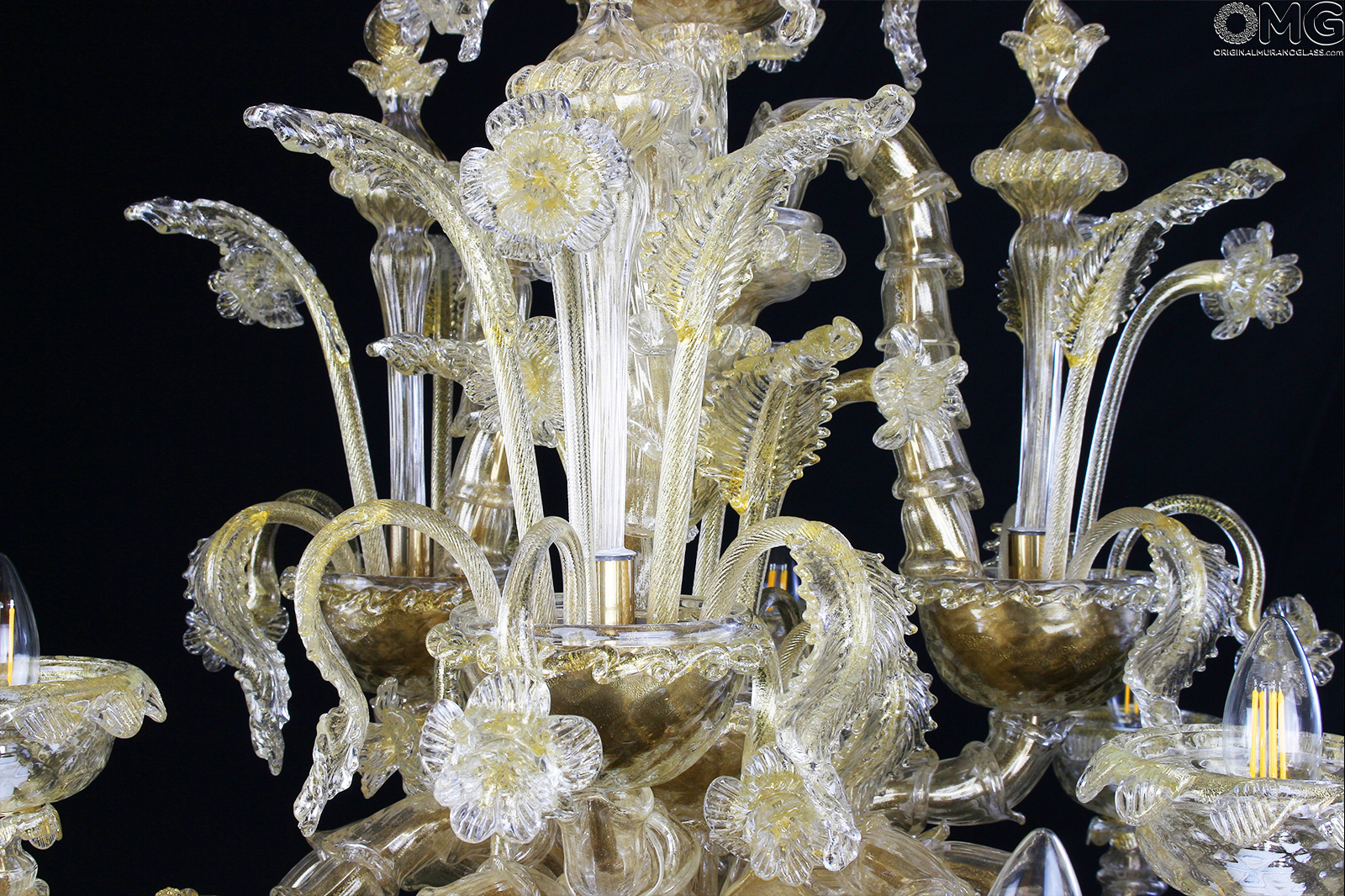 Luxury venetian chandelier handmade in original Murano glass Rezzonico style, blown glass with gold 24 kt in all its parts.