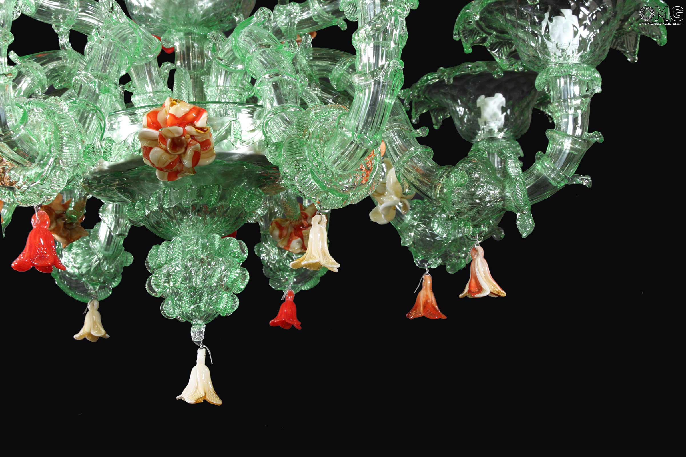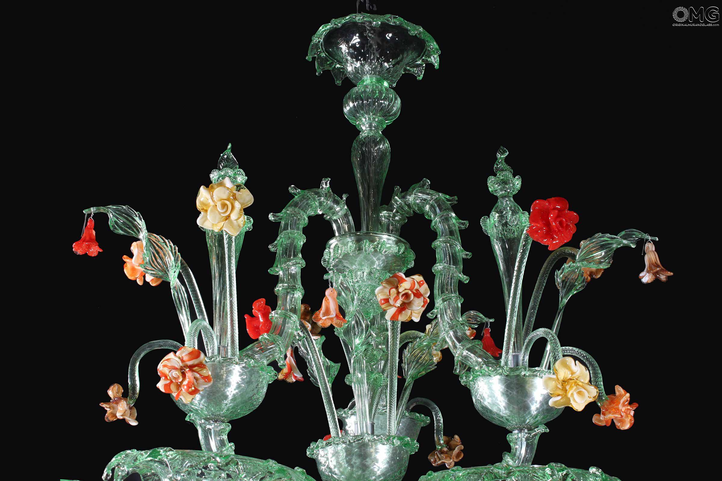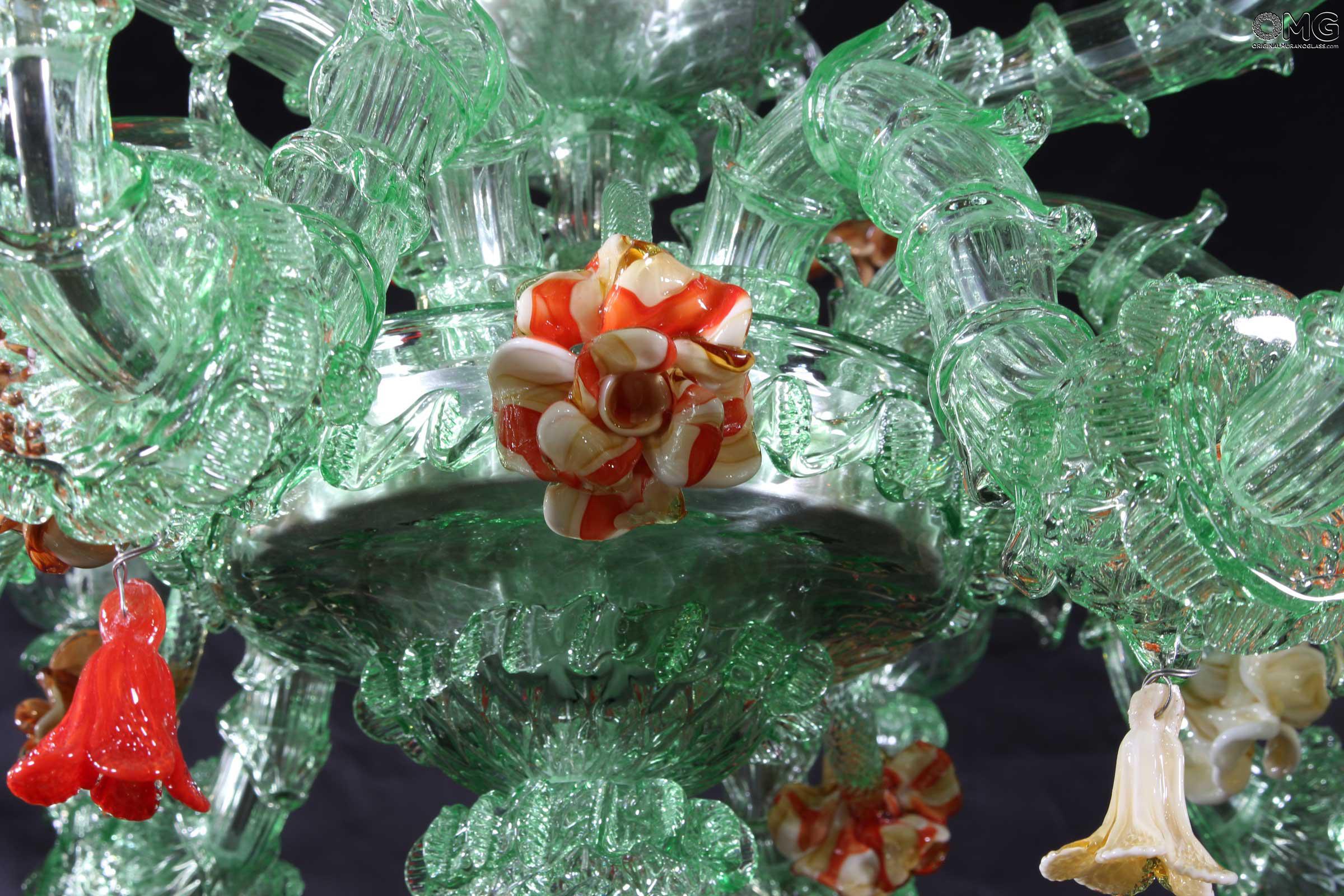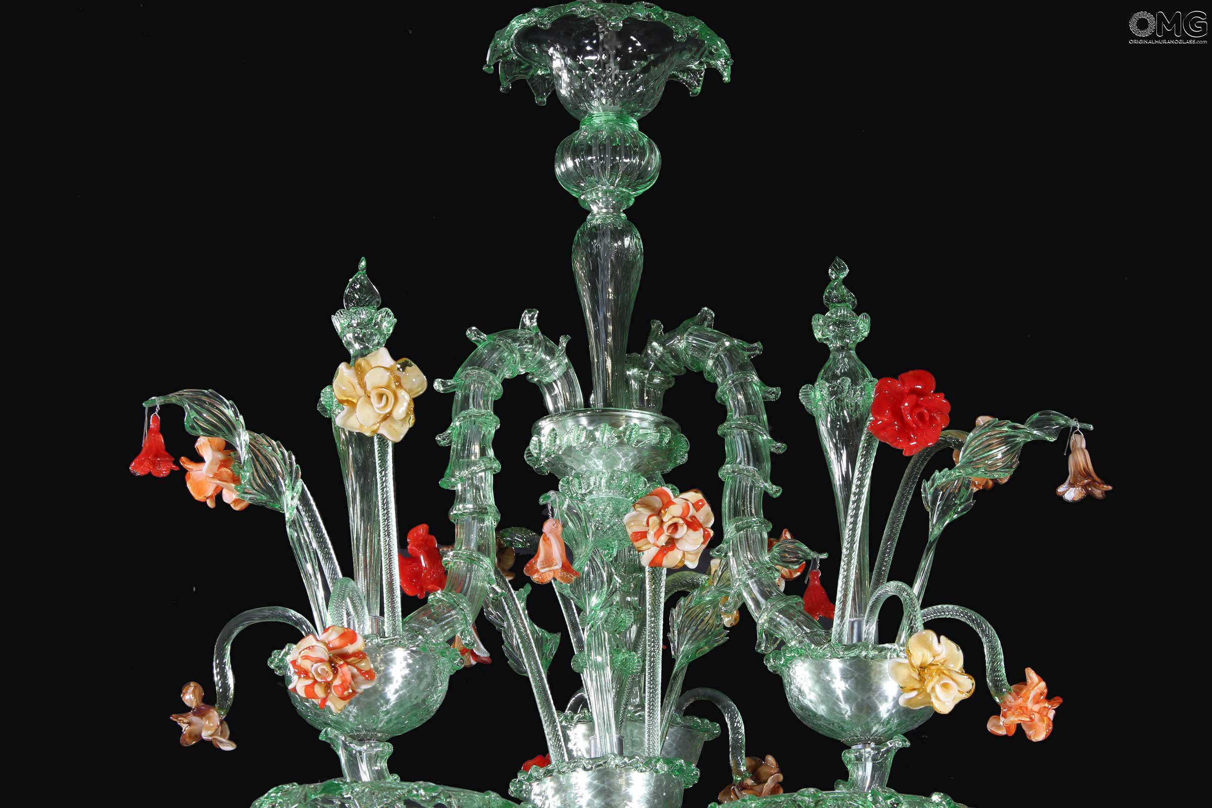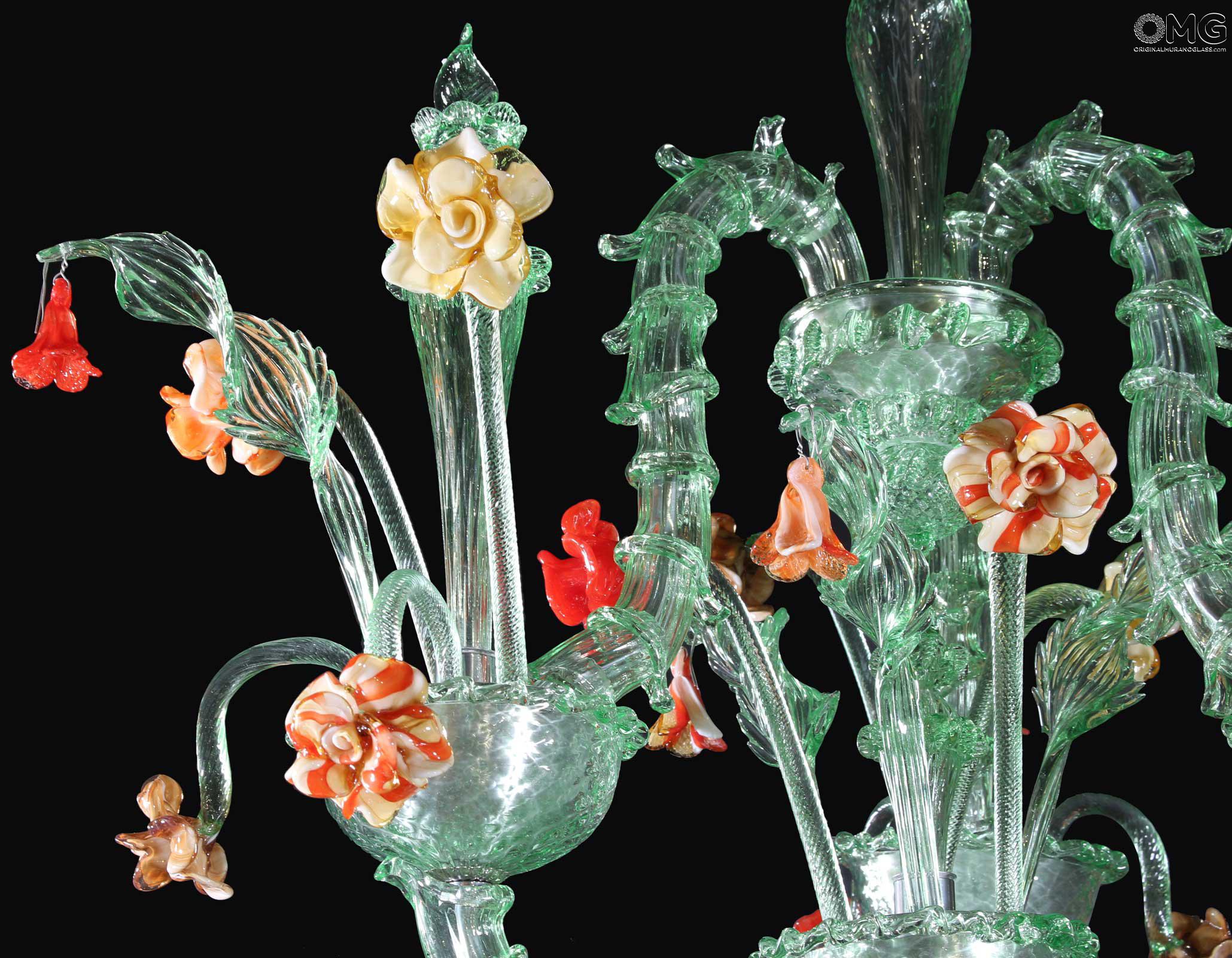 The artwork is a floral chandelier in Venetian style, this Murano chandelier enriches any interior room with elegance; Ideal for any room space, classique but also modern interior design. This venetian chandelier is an art piece itself, completely decorated and shaped by hand.