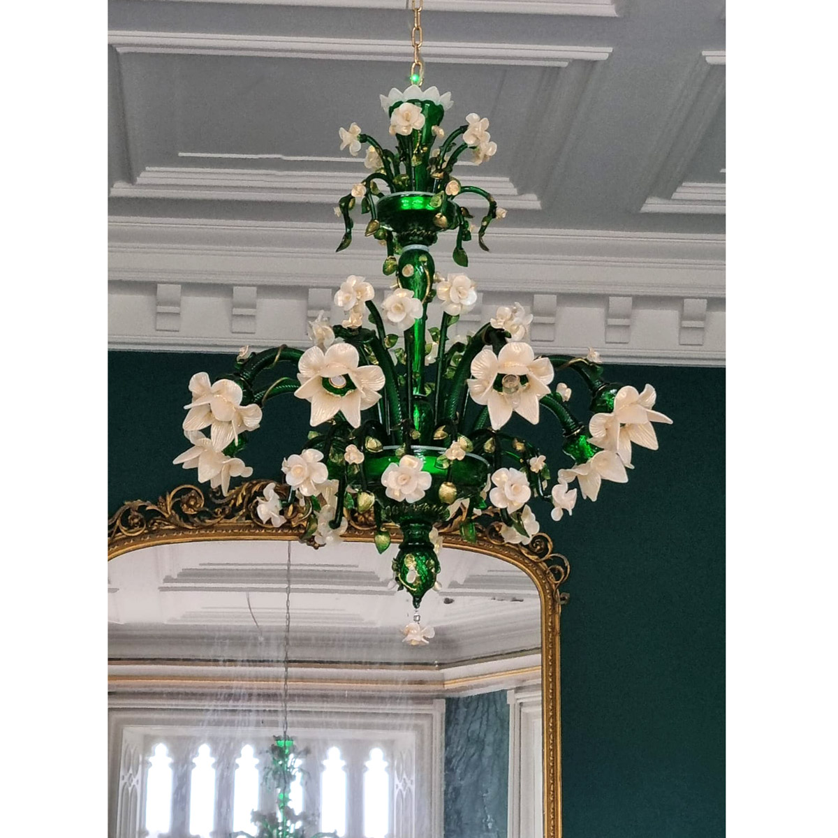 Chandelier Venetian glass, green, white and pure gold 24kt details.
