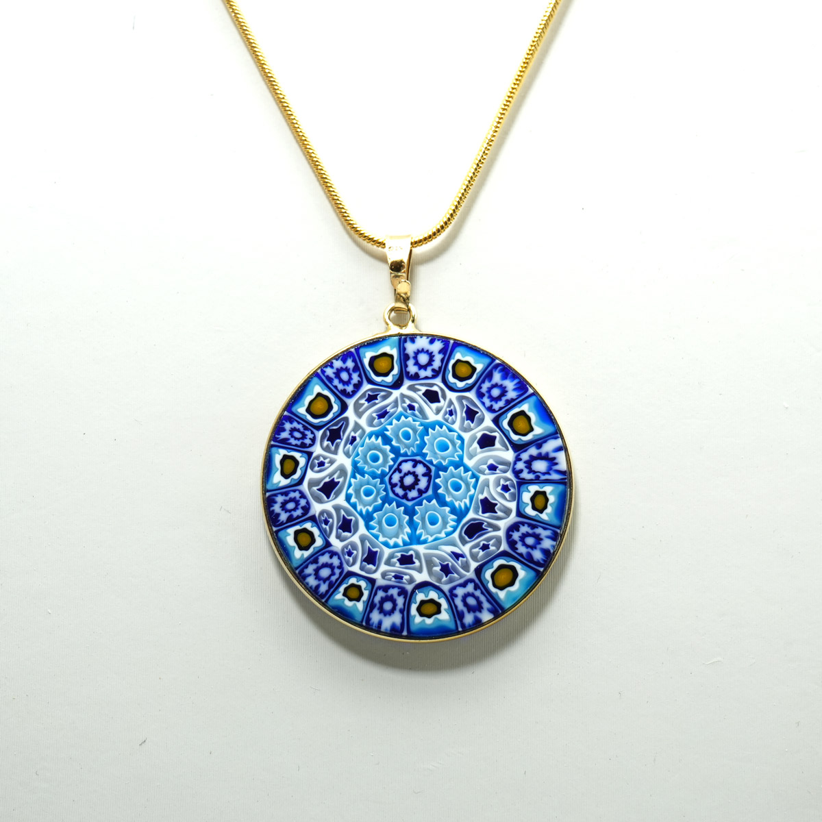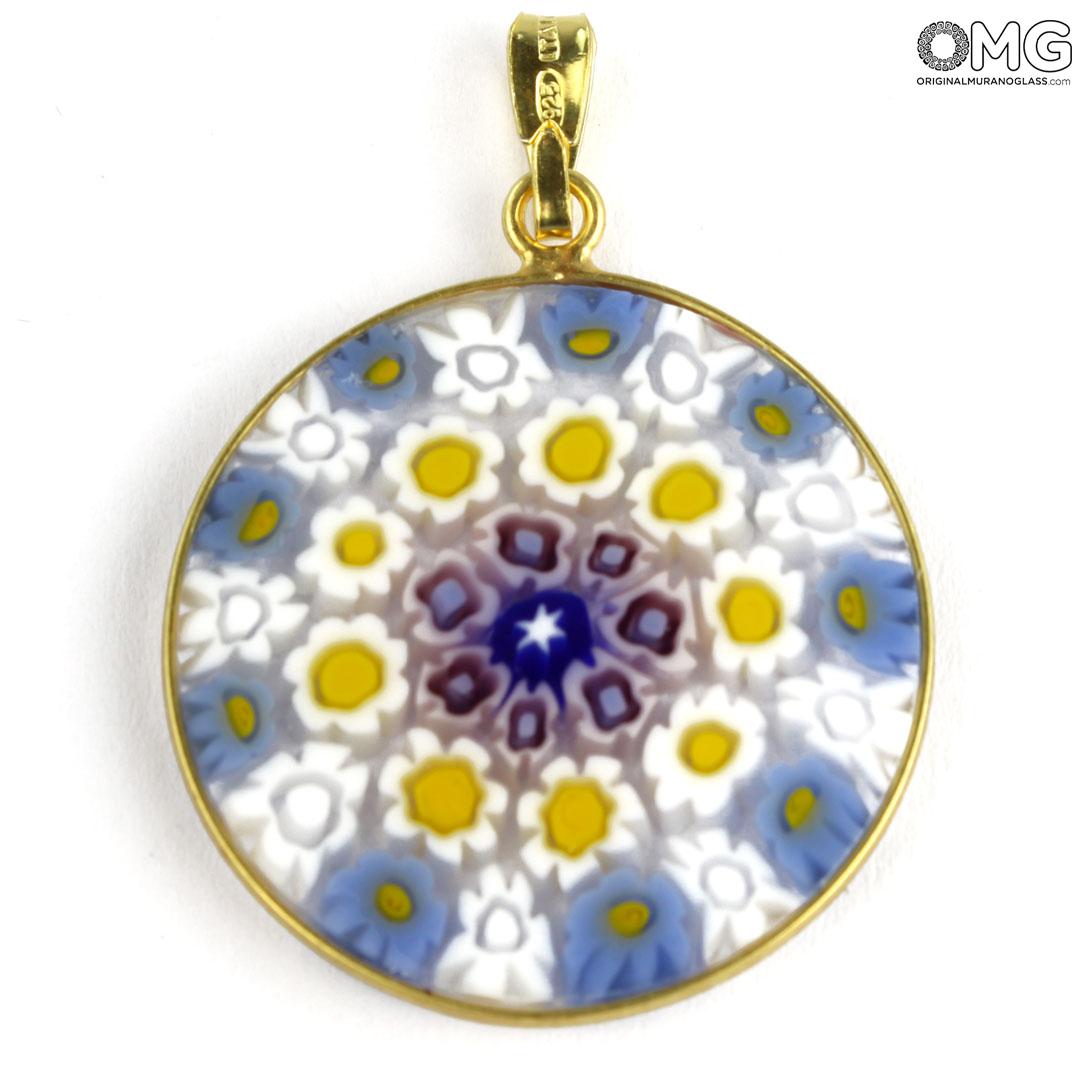 This Murano glass pendant is handmade using the characteristic Murano glass technique Millefiori Murrina (a thousand flowers), which is one of the trademark of Murano glass making. The Murano glass accessory features a symmetric eye-catching pattern of colorful stylized flowers.