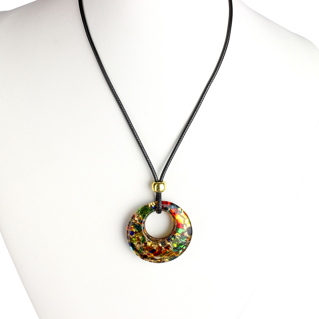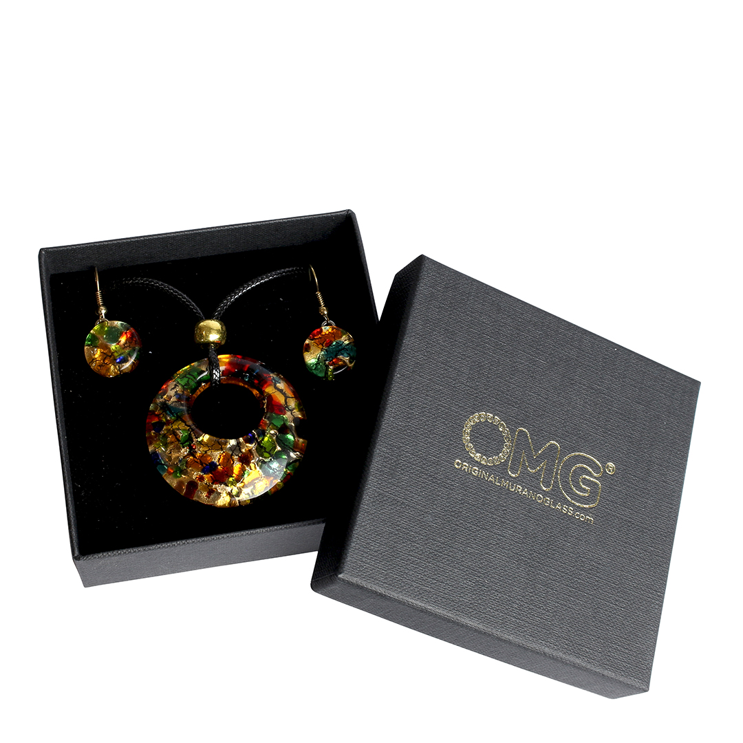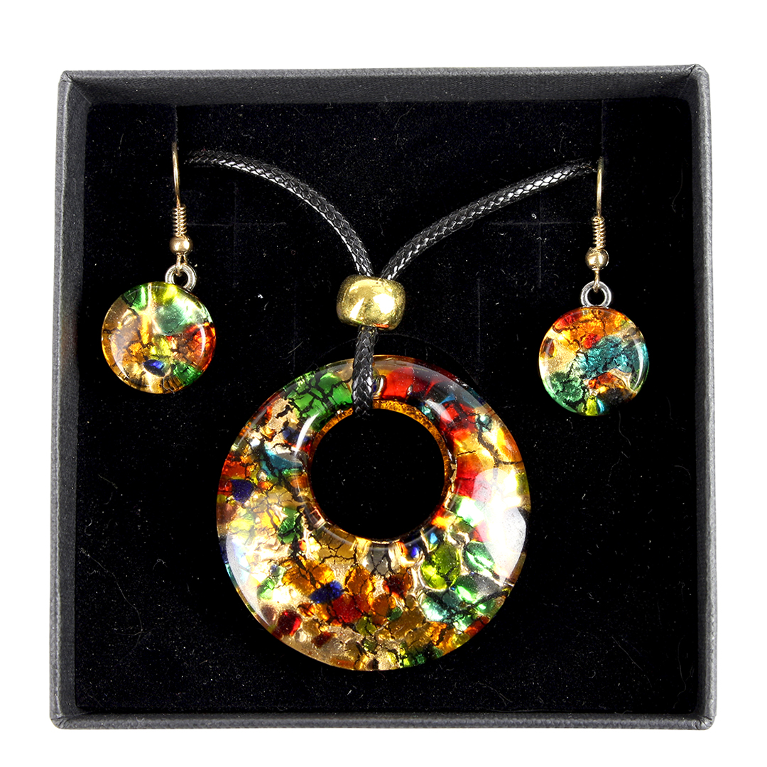 The "Cortina round" Murano glass jewelry set is an elegant parure handmade with fused glass and enriched with gold leaf. The set consists of a necklace with a colorful Murano glass pendant and matching earrings with beads enclosed in a circular, nickel free wire mesh.
