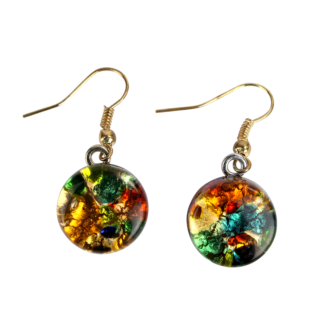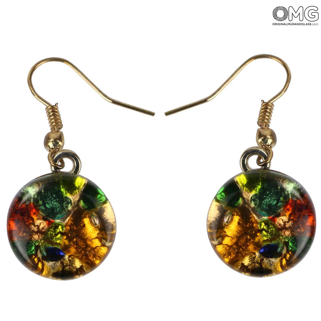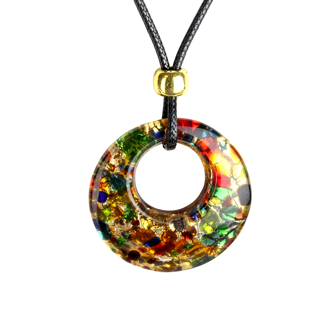 The "Cortina round" Murano glass jewelry set is an elegant parure handmade with fused glass and enriched with gold leaf. The set consists of a necklace with a colorful Murano glass pendant and matching earrings with beads enclosed in a circular, nickel free wire mesh.