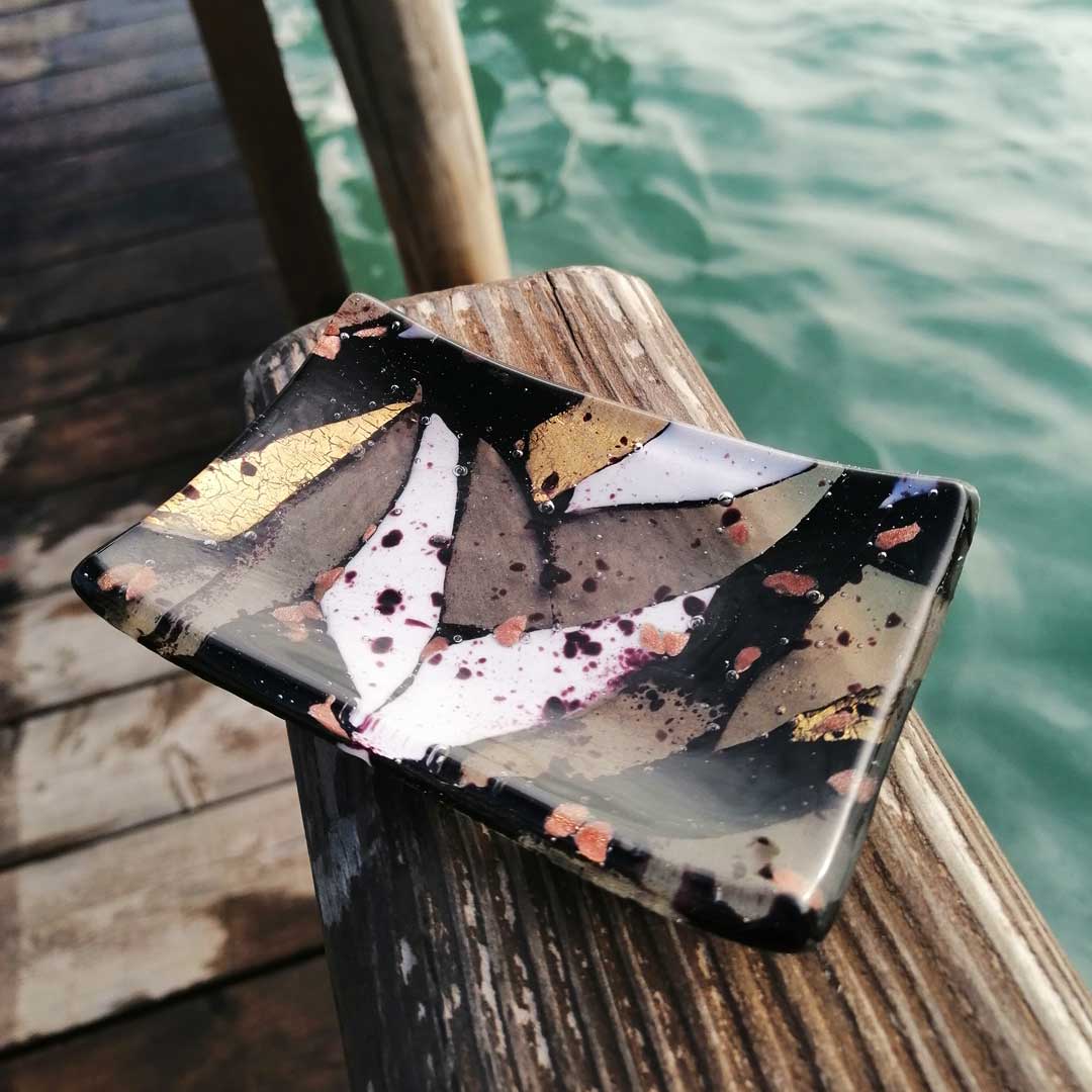 Assiette réalisée selon la technique du fusing, rehaussée d'une précieuse feuille d'or véritable 24 carats. Disponible en plusieurs tailles, la petite version peut servir de pochette ou de cadeau de mariage, tandis que la plus grande peut faire office de centre de table.