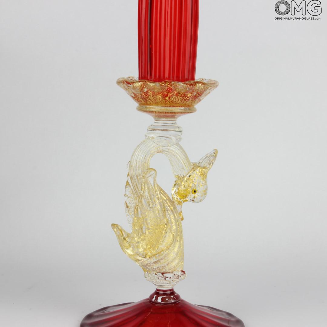 Detailed handmade candle holder made using the traditional Murano Glass technique. The holder is in red glass and the stem is in transparent Murano crystal glass with gold 24 carats. Perfect for your candlelight dinners in venetian style.