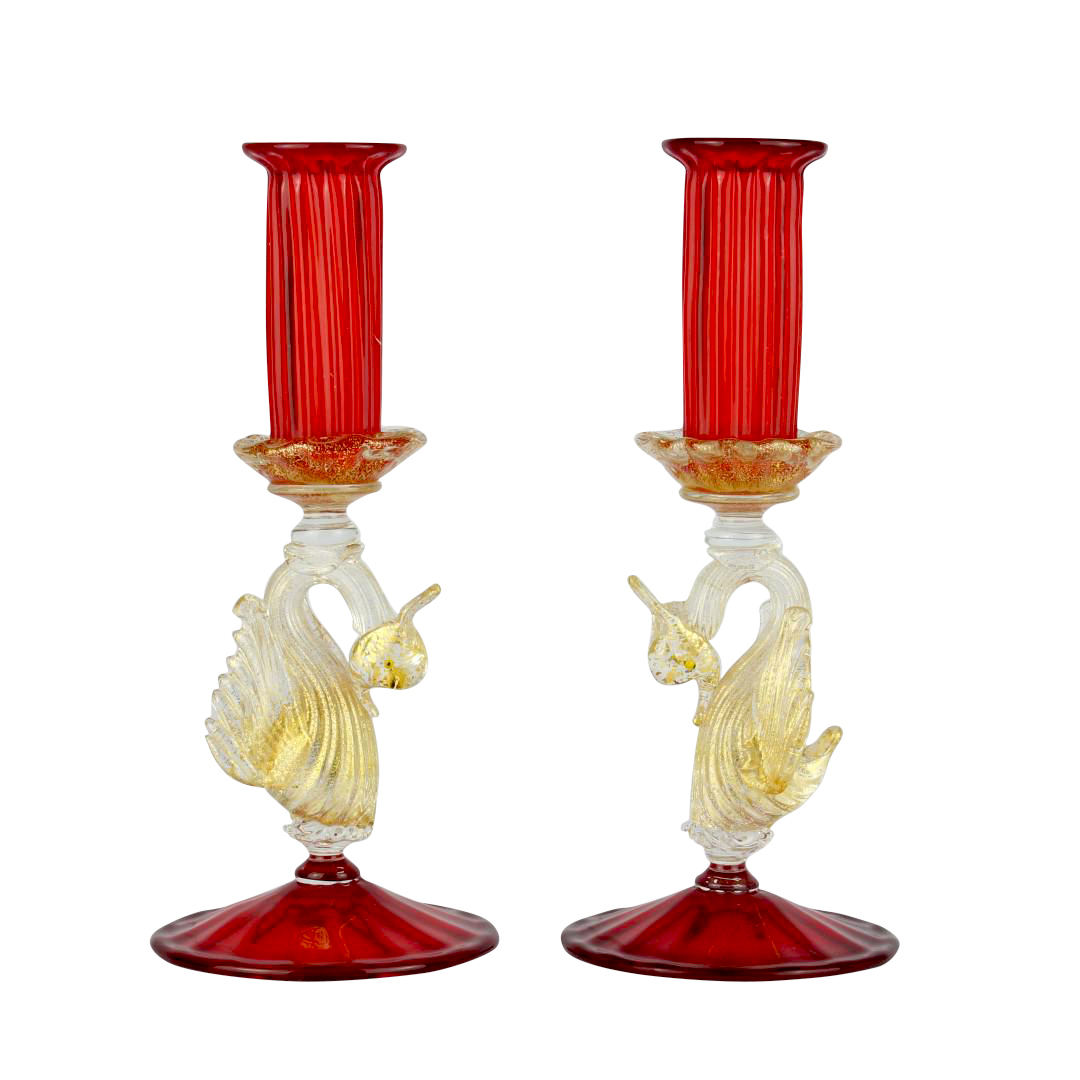 Set of 2 Classic Venetian Red Candle Holders - Murano Glass