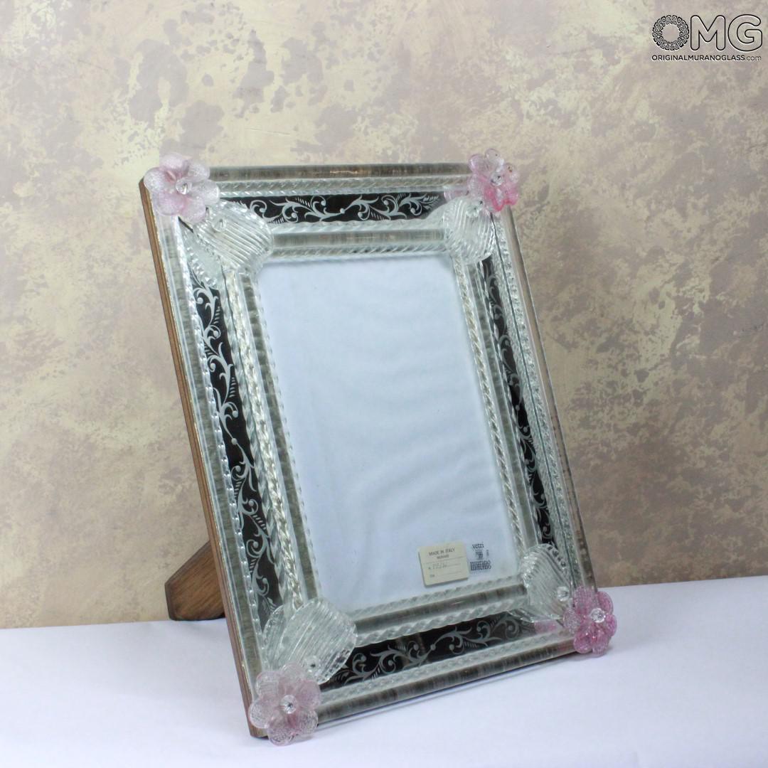 Porta foto in vetro e oro, classico stile veneziano, artigianale, realizzato a Murano con incisioni in pietra arenaria.