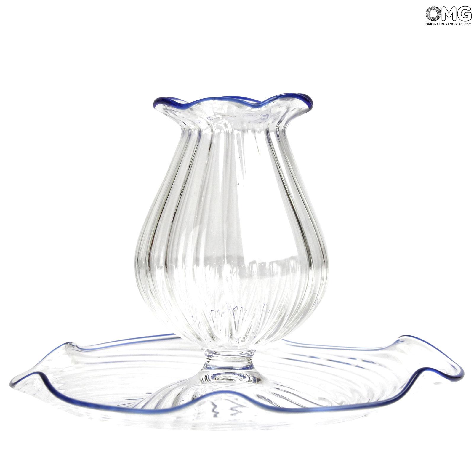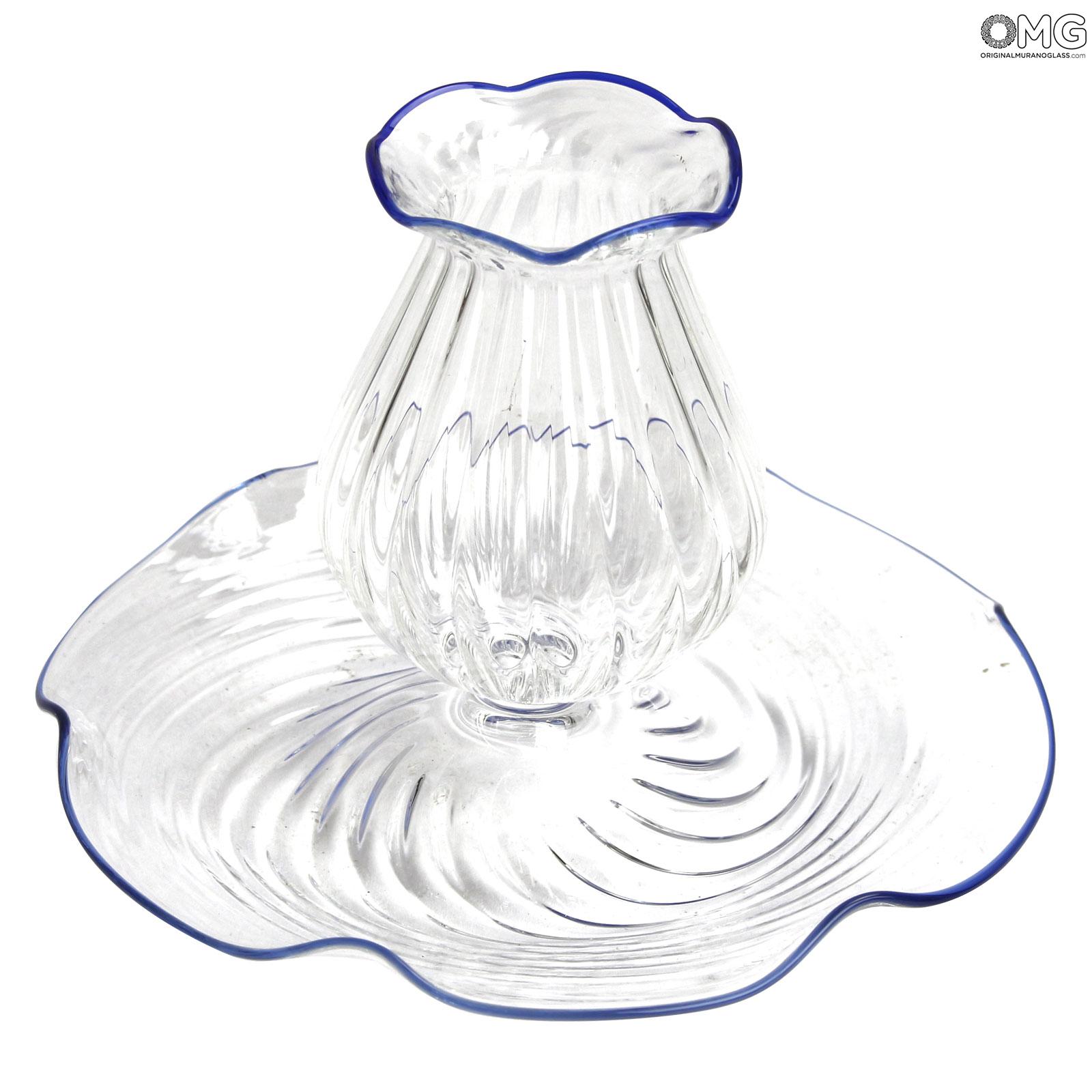 Il vetro è trasparente, orlato di blu, la bravura del maestro sta nel creare un effetto di movimento nel vetro. La parte piu' bassa sembra giri su se stessa, quasi mossa dal vento.