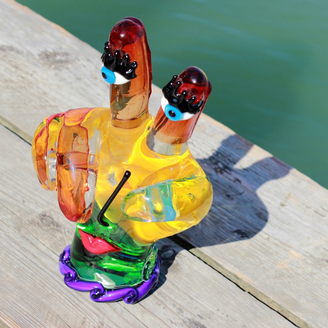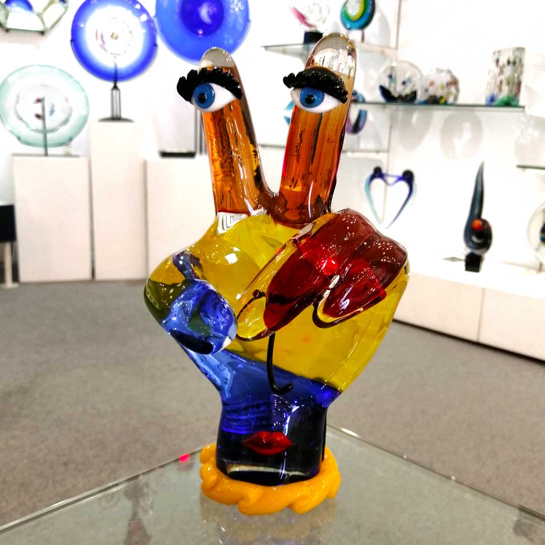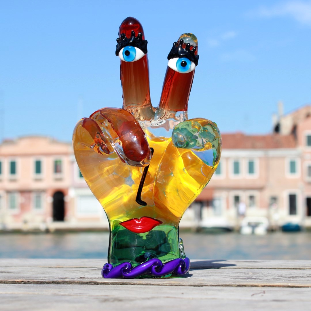 L'arte del vetro di Murano ottiene un inaspettato tocco contemporaneo in questa scultura unica della mano di Picasso. In un omaggio all'artista più famoso e rivoluzionario del XX secolo, Pablo Picasso, gli inventivi maestri di Murano hanno creato questa scultura in vetro di Murano, che riflette lo stile astratto e l'approccio d'avanguardia di Picasso all'arte. La mano ispirata a Picasso rappresenta il movimento surrealista nell'arte, con colori vivaci e tratti del viso. I ricchi colori profondi del rosso, giallo, arancione e blu e gli occhi azzurri curiosi trasmettono uno stato d'animo solare e un'atmosfera di liberazione dai canoni dell'arte e della tradizione.