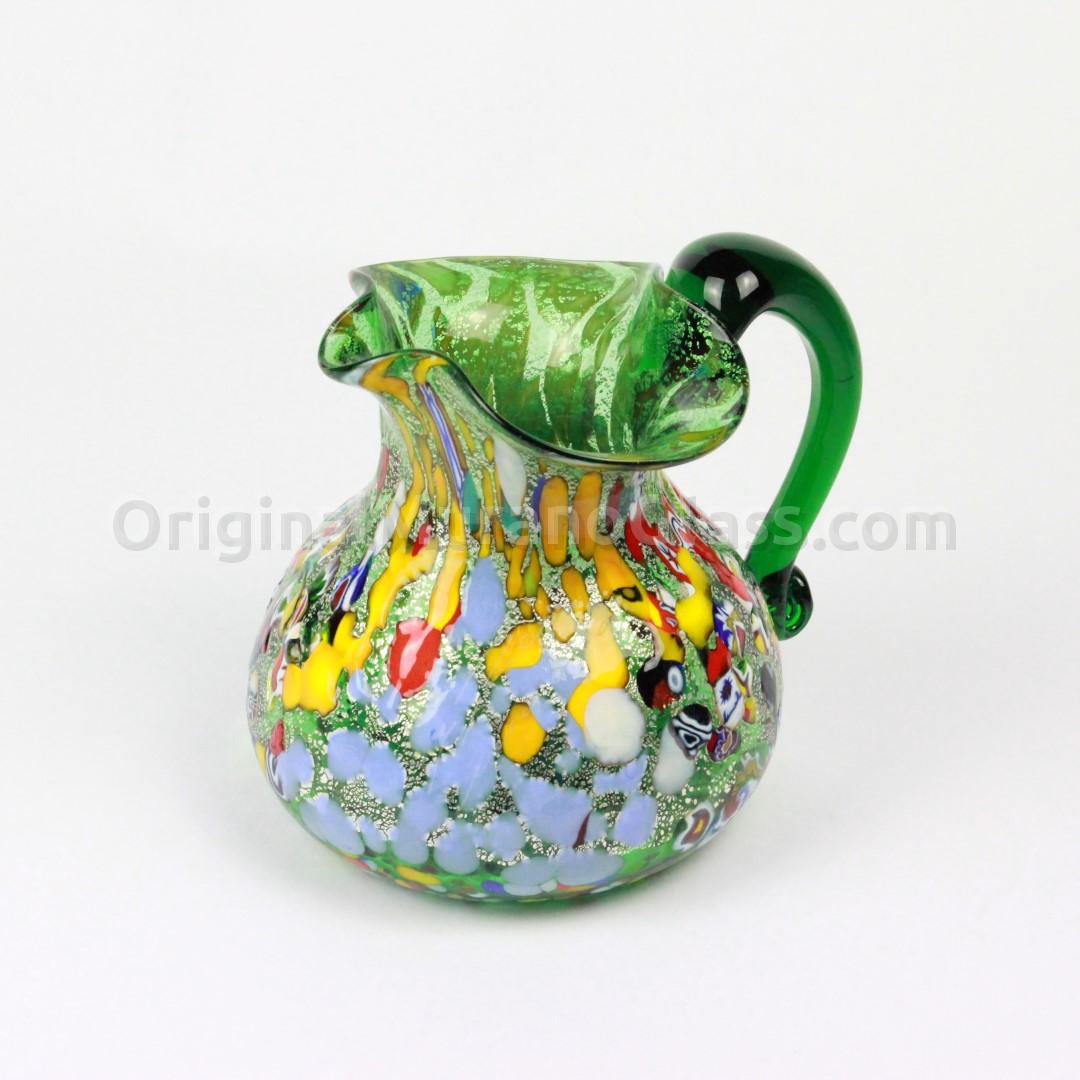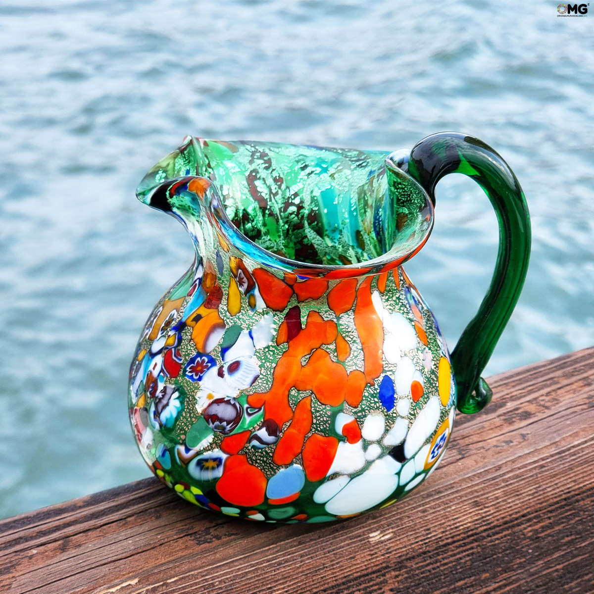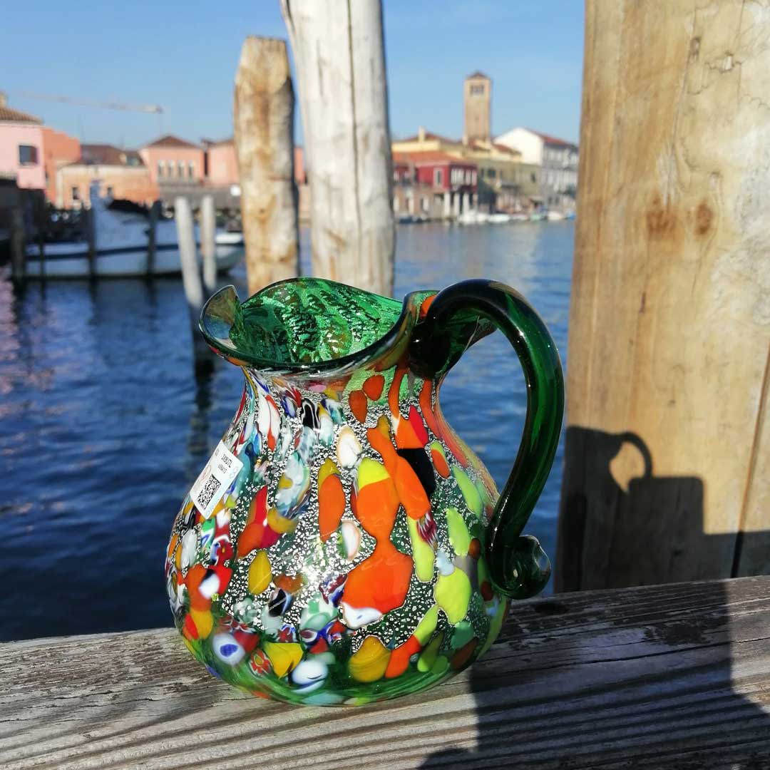 Questa splendida piccola caraffa in vetro di Murano è un autentico capolavoro artigianale. Realizzata a mano da abili maestri vetrai e impreziosita con foglia argento, presenta un design vivace e colorato, arricchito da macchie di vetro irregolari che creano un effetto affascinante. La combinazione di arancione brillante, azzurro e altri colori vivaci rende questa caraffa un pezzo unico, sia decorativo che funzionale. Poiché ogni caraffa è lavorata artigianalmente, la disposizione dei colori è casuale, garantendo che non ne esistano due uguali. Questo rende la tua caraffa un’opera esclusiva, capace di portare un tocco di arte veneziana nella tua casa.