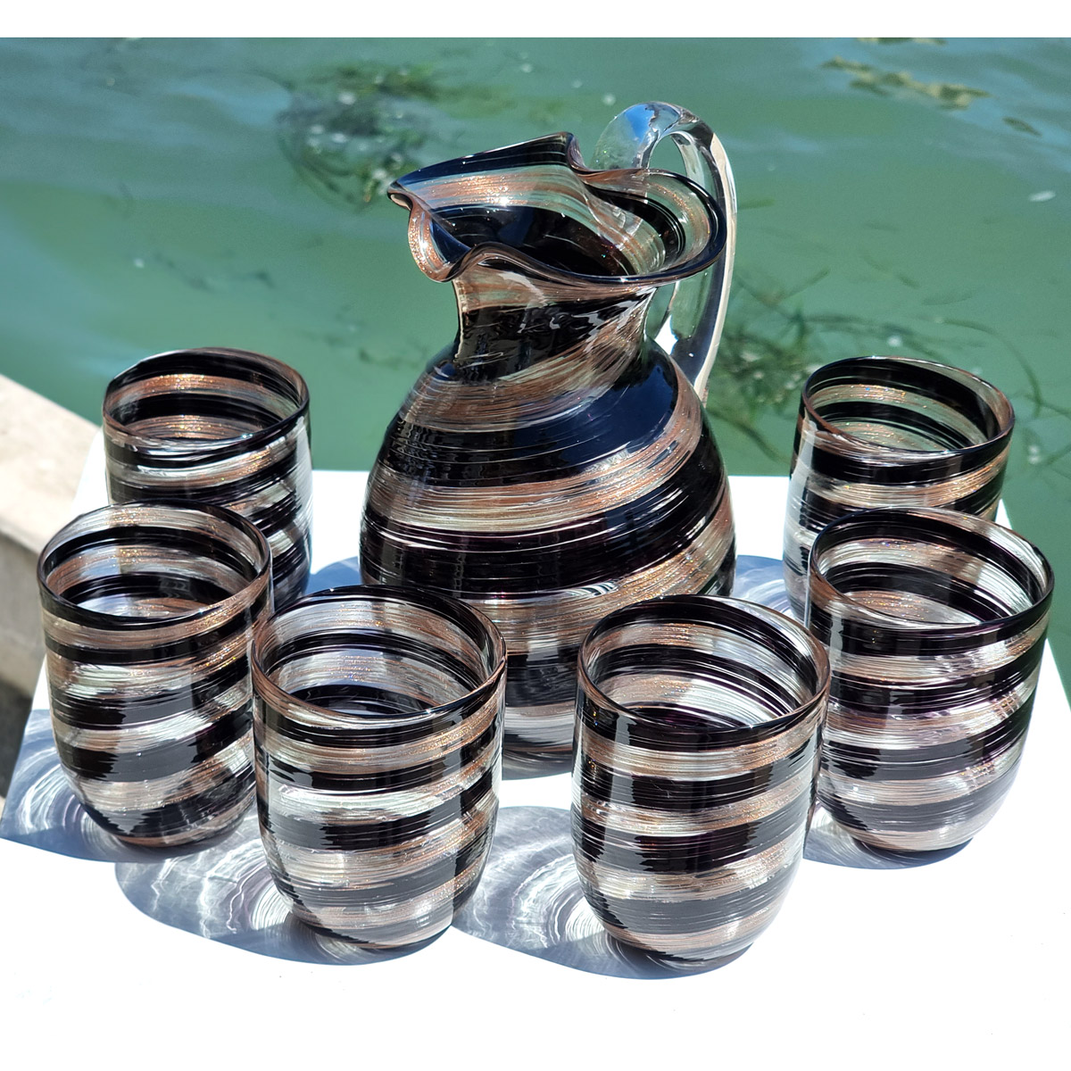 Questa caraffa è realizzata con la tecnica del vetro soffiato con decoro in murrina. Questa caraffa è un'idea perfetta per disporre di un tavolo comodo ed elegante dove ricevere i tuoi ospiti.
