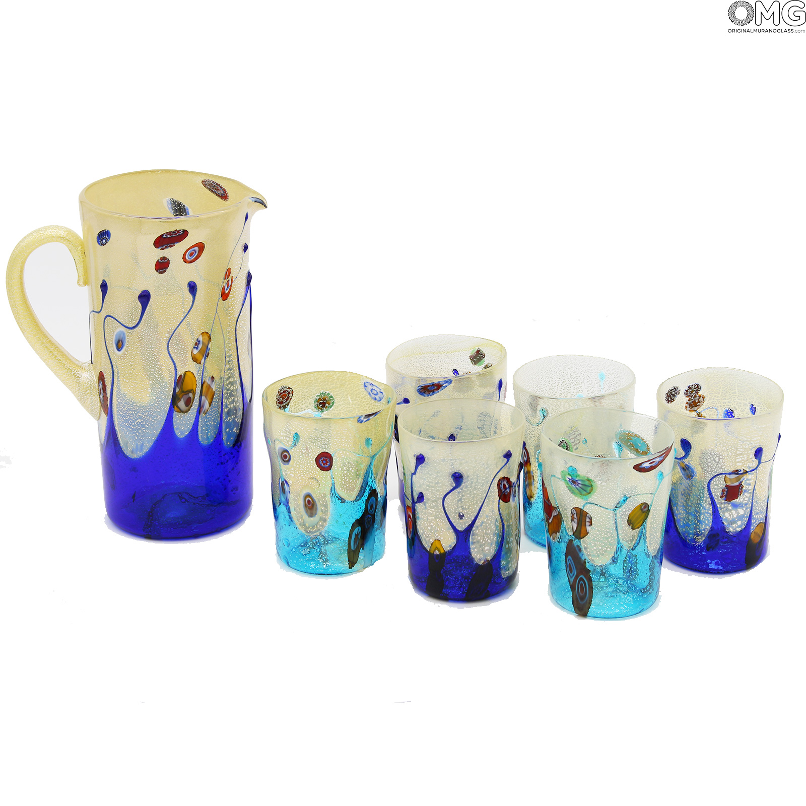 Splendido capolavoro d'arte fatto a mano con vetro multicolore azzurro e blu, puro argento. La brocca viene prima realizzata con la tecnica del vetro soffiato. Alla massa principale di vetro vengono poi aggiunti piccoli pezzi (chiamati macete in veneziano, piccole macchie) o canne di vetro. Il risultato è una brocca multicolore che prende ispirazione dall'impressionismo e dall'espressionismo astratto.