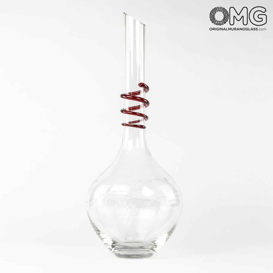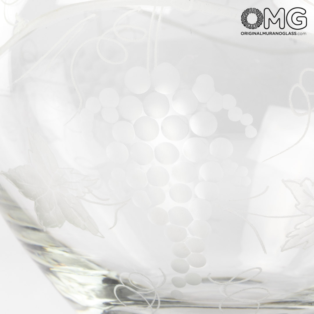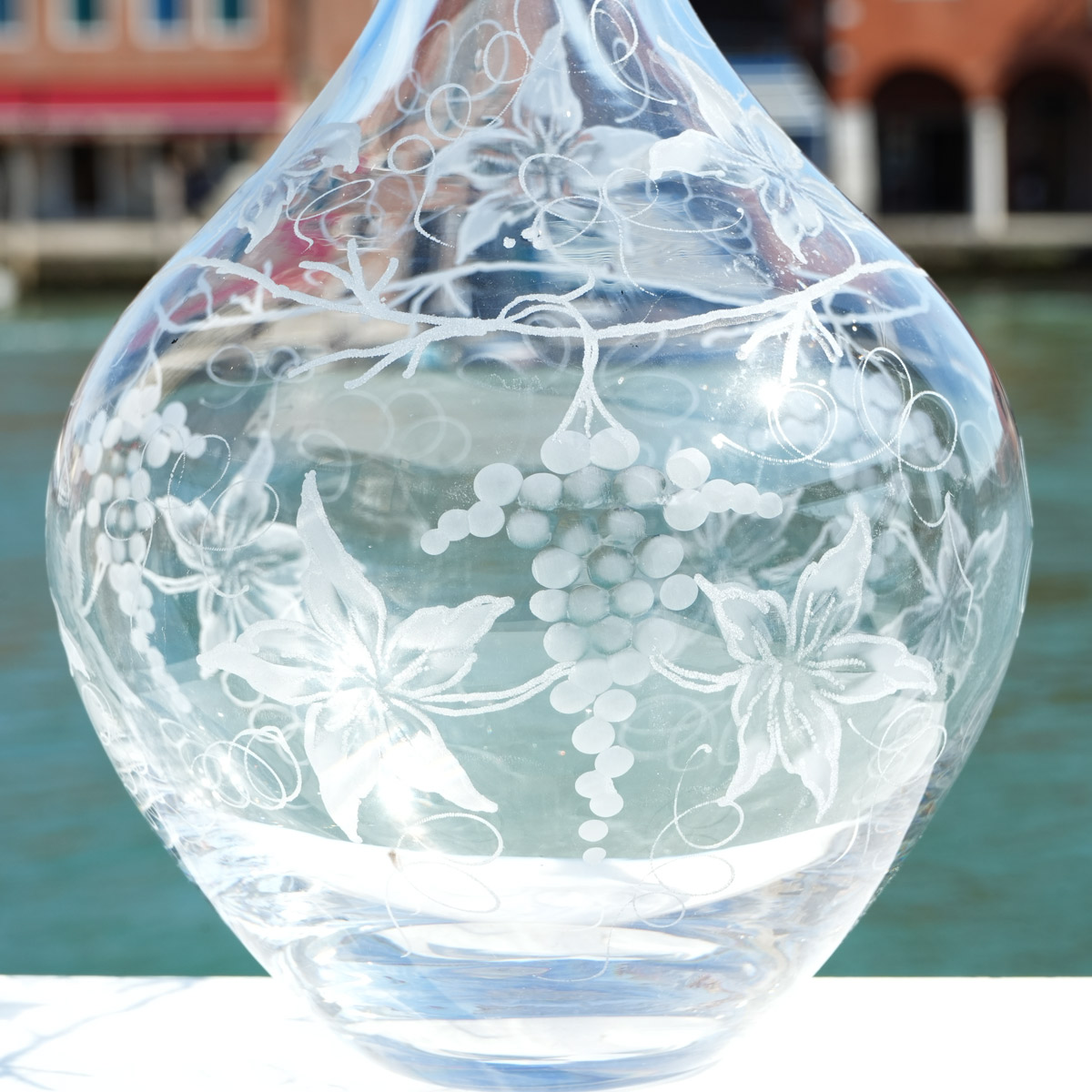 Elegante decanter in cristallo soffiato e accuratamente inciso a mano a Murano con motivi floreali.