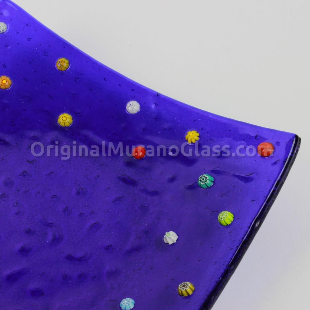 Assiette carrée en verre noir ornée d'un magnifique décor en murrina. Réalisée selon la technique de la fusion du verre.