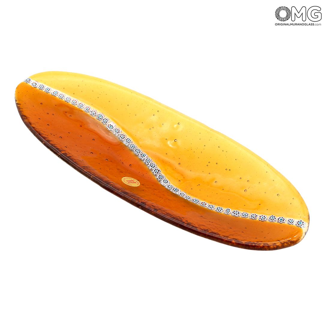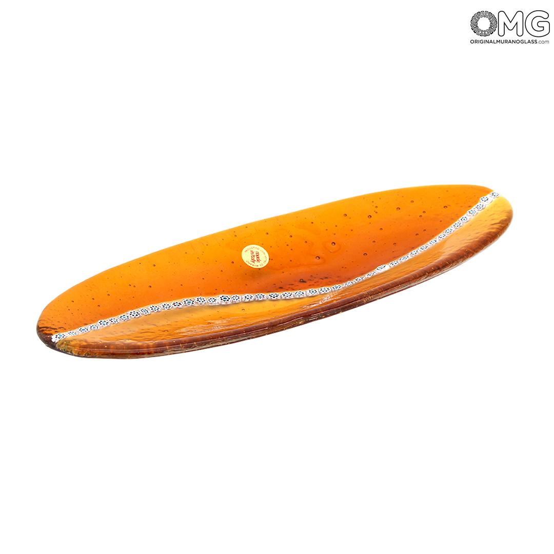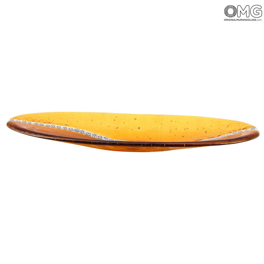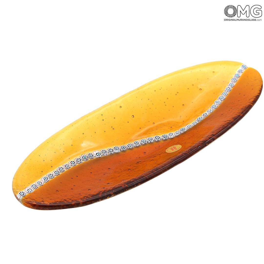 Assiette AMBRA en verre de Murano de forme ovale, ornée d'un décor en murrina, réalisée selon la technique de la fusion du verre. Pièce fabriquée à la main, pouvant servir de vide-poche ou de bonbonnière. Pour les commandes en grande quantité, les cadeaux de mariage et les cadeaux d'entreprise, veuillez nous contacter.