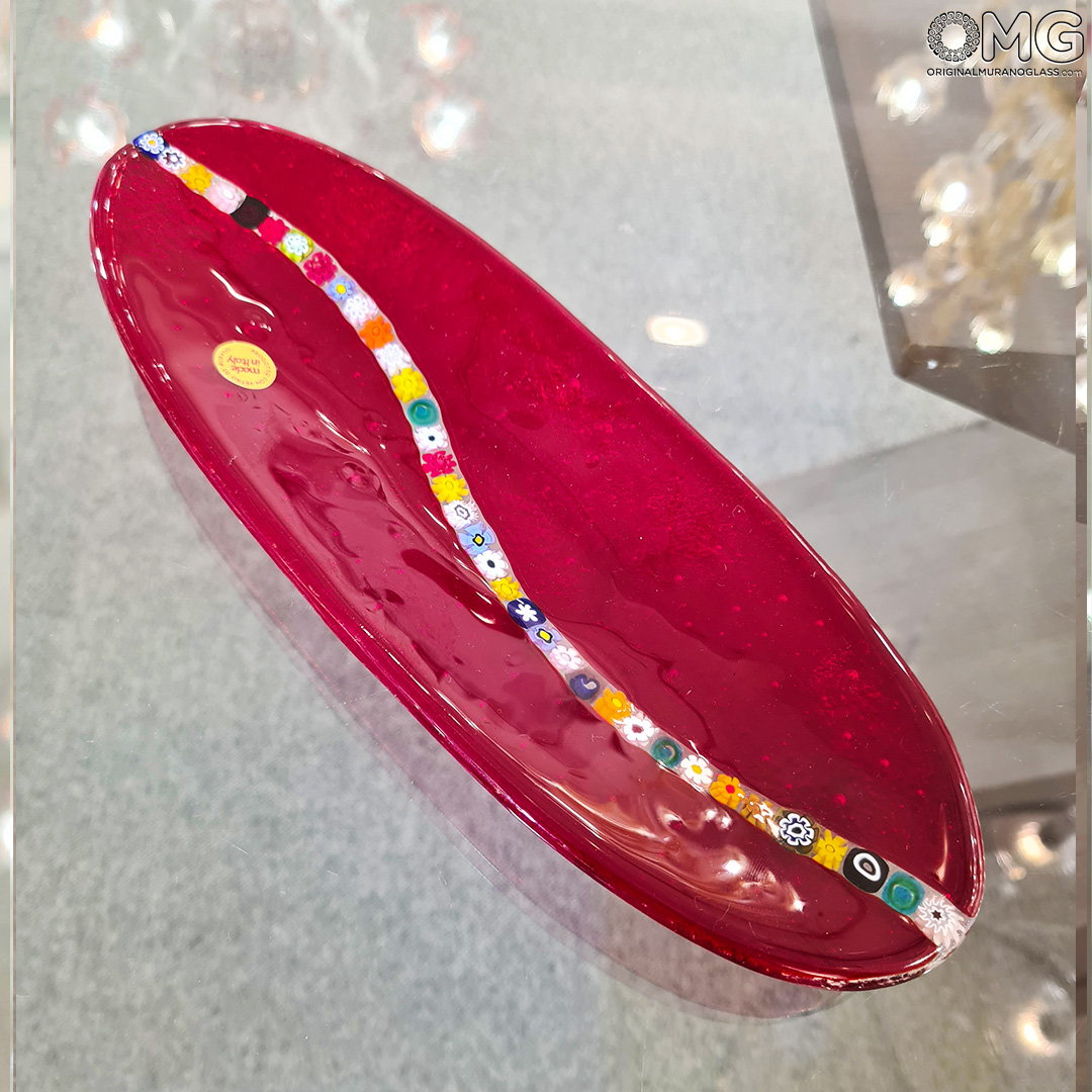 Assiette ovale en verre rouge ornée d'un motif en murrina millefiori, réalisée selon la technique de la fusion du verre. Objet fabriqué à la main, pouvant servir de vide-poche ou de bonbonnière. Pour les commandes en grande quantité, les cadeaux d'invités et les cadeaux d'entreprise, veuillez nous contacter.