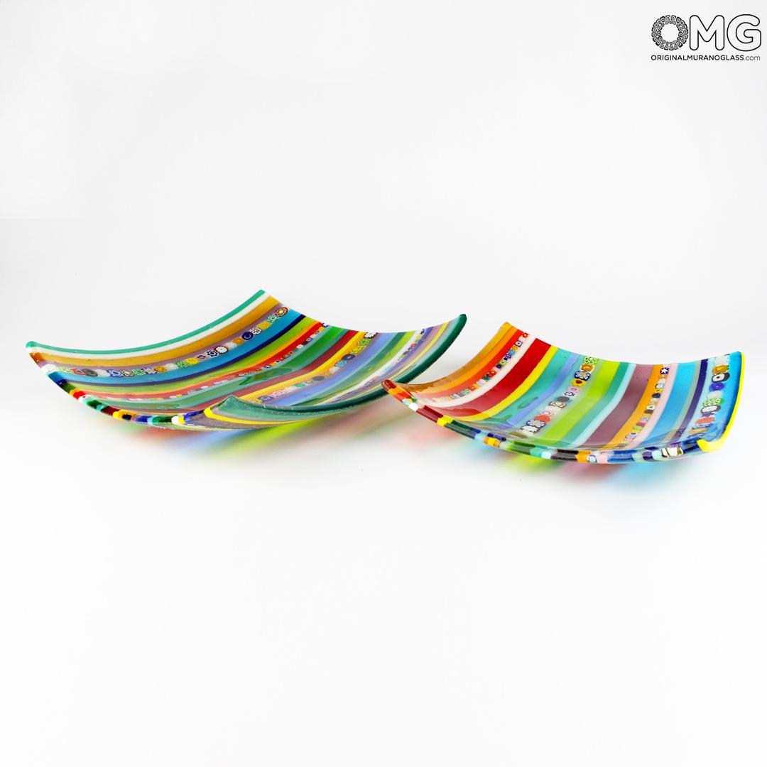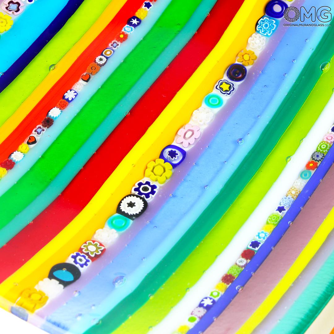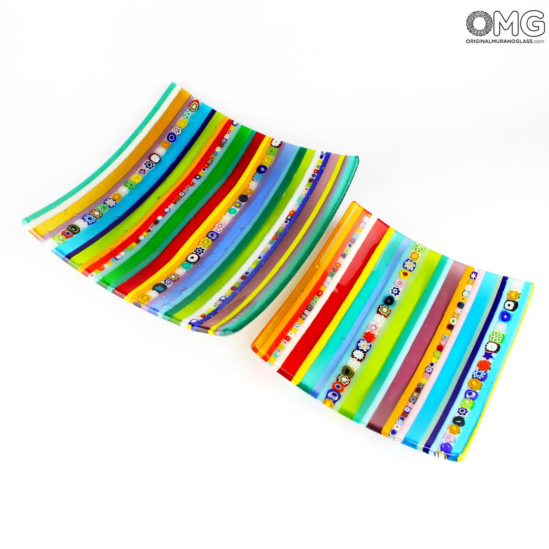 Piatto realizzato con la tecnica della vetrofusione in vetro di Murano ed impreziosito da murrine e canne di vetro colorate.