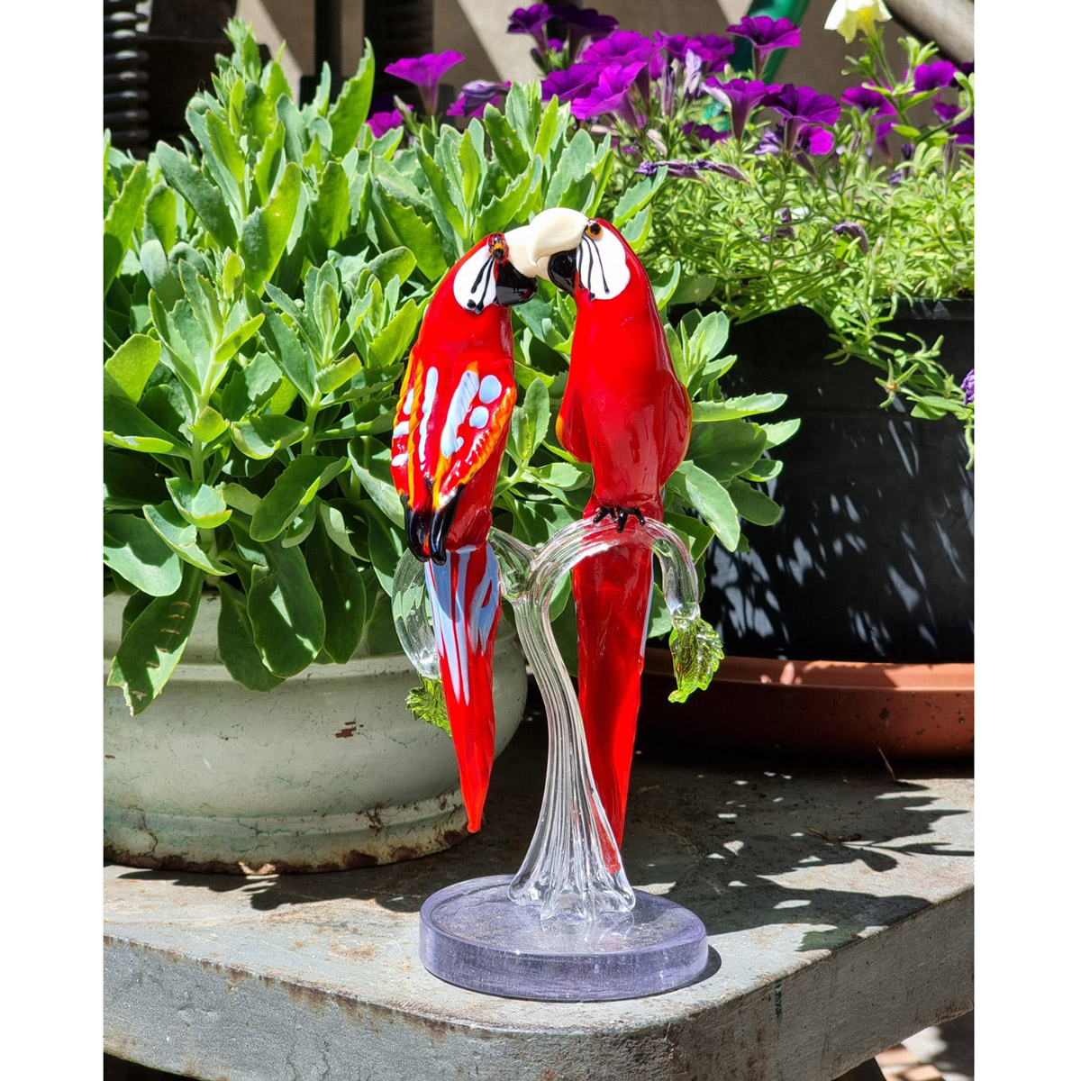 Sinuosa scultura di pappagalli su base di cristallo, lavorato a mano libera a puntello con le tecniche di lavorazione del vetro a Murano. Questa bella scultura, estremamente elegante, è l'opera d'arte perfetta per un ripiano di lusso o per completare il ricco mobilio della tua casa. Puoi metterla sotto la luce di una lampada, sul tavolo o in prossimità di una pianta. Ovunque la poni, questa elegante scultura ti regalerà tutto il suo fascino.