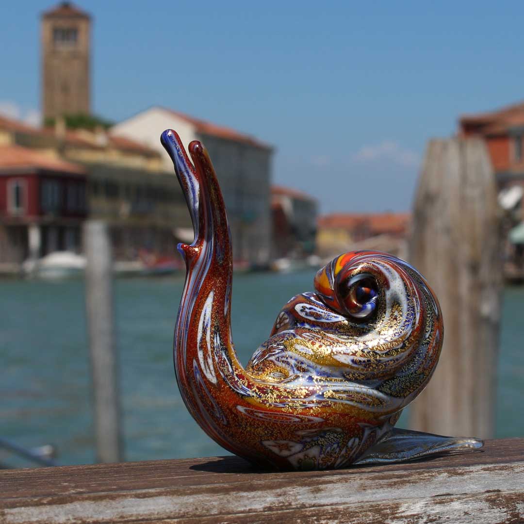 Miniature, sculpture réalisée à la main à Murano à partir de murrines de verre et d'or pur. L'œuvre est entièrement réalisée à la main, sans recours à des moules ; chaque pièce est unique.
