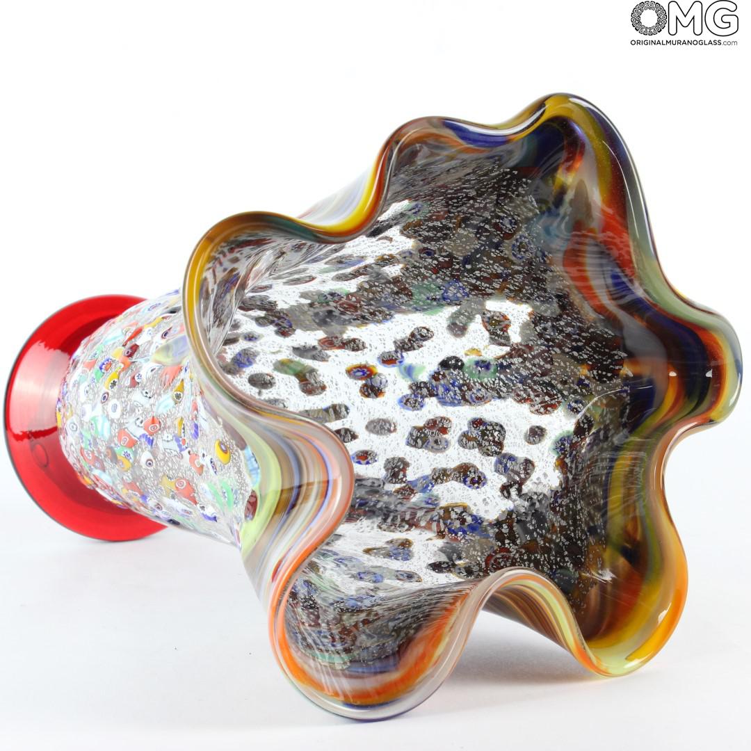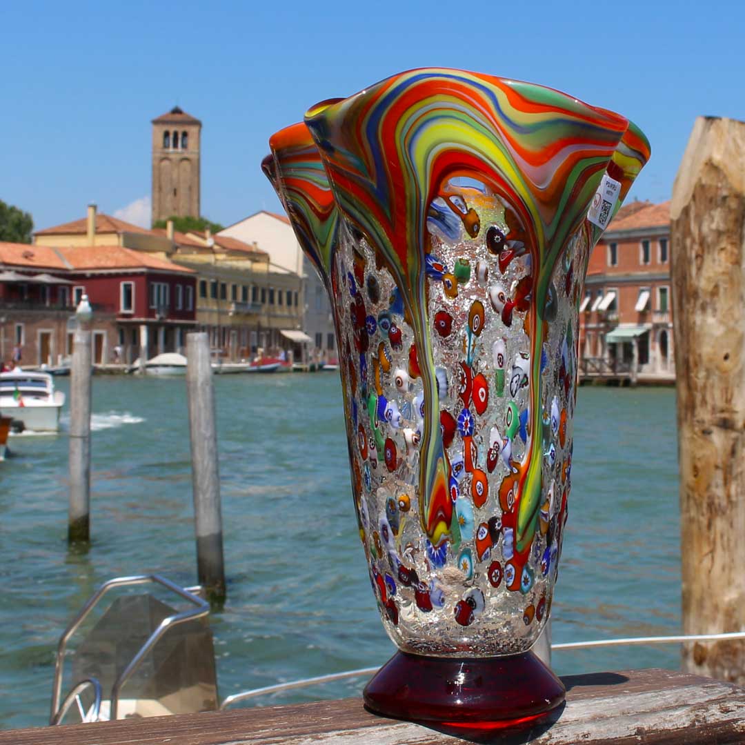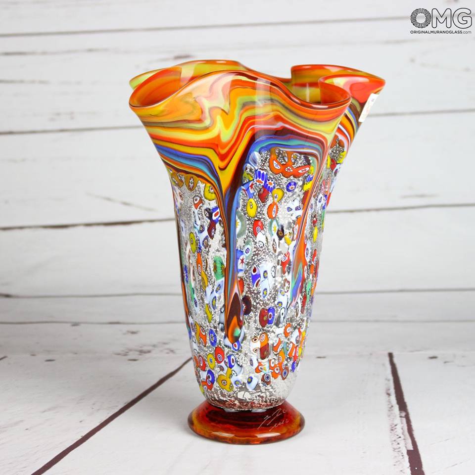 Vaso realizzato con la tecnica del vetro soffiato decoro in foglia d'argento e murrina. Opera firmata dal maestro e con il marchio Vetro Artistico® Murano applicato.