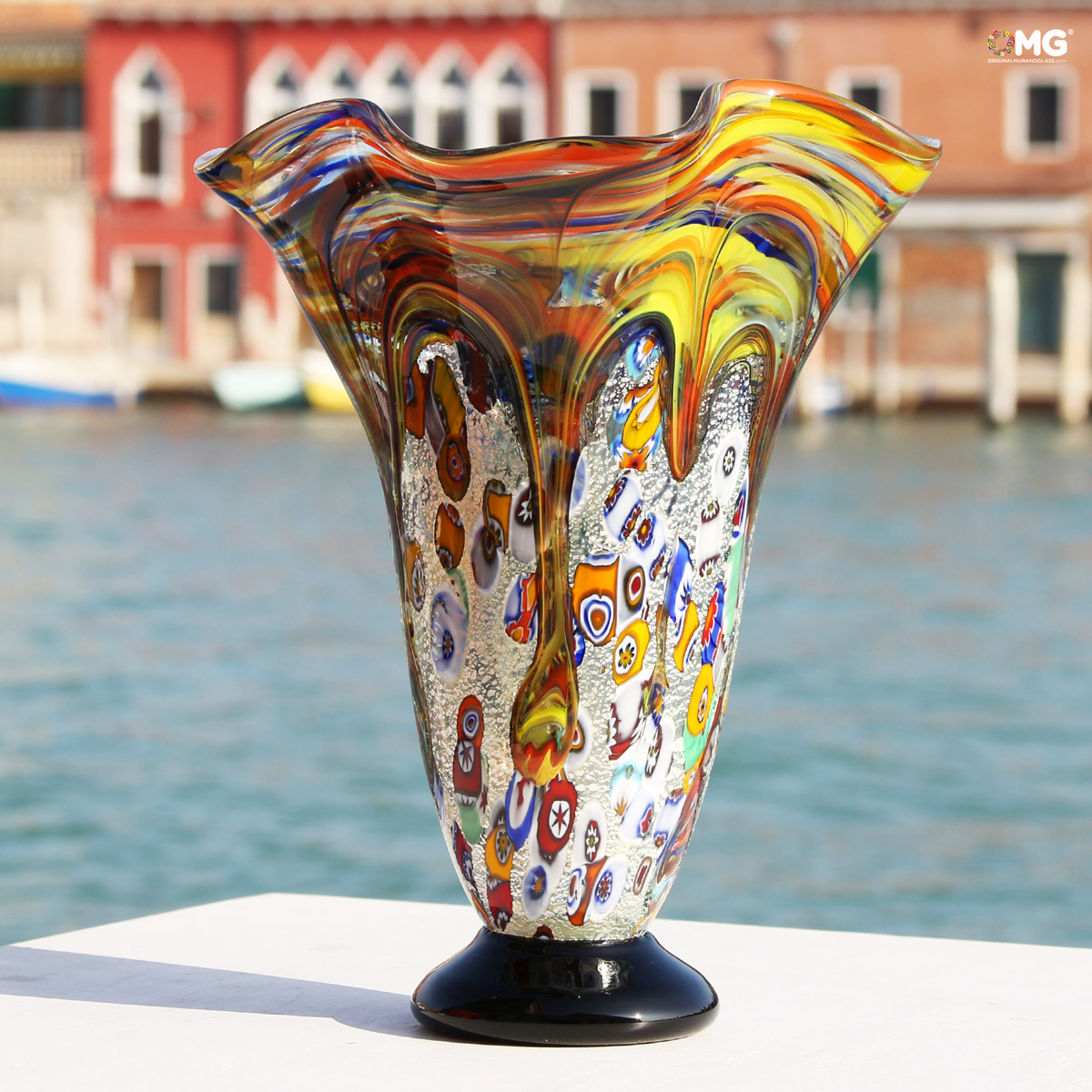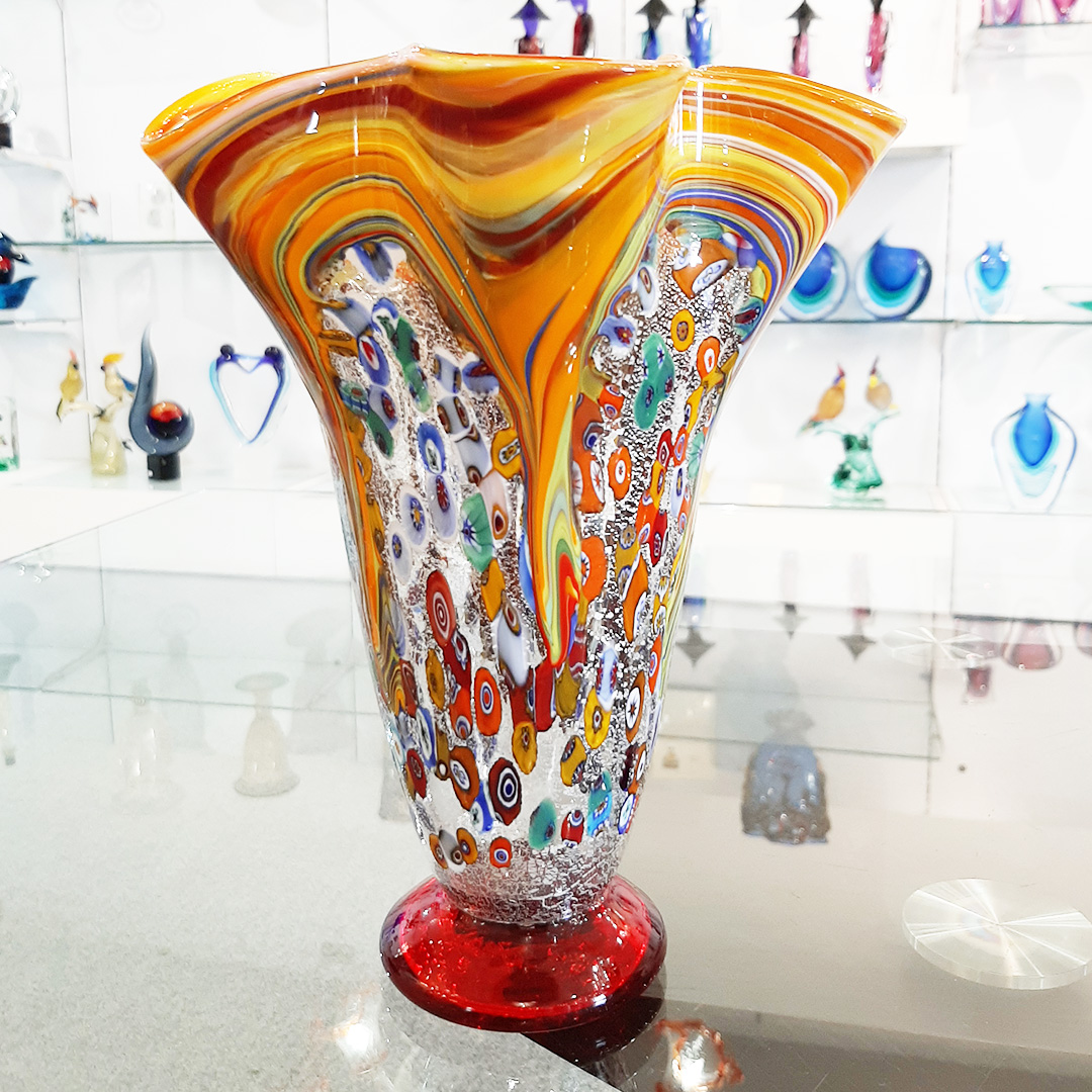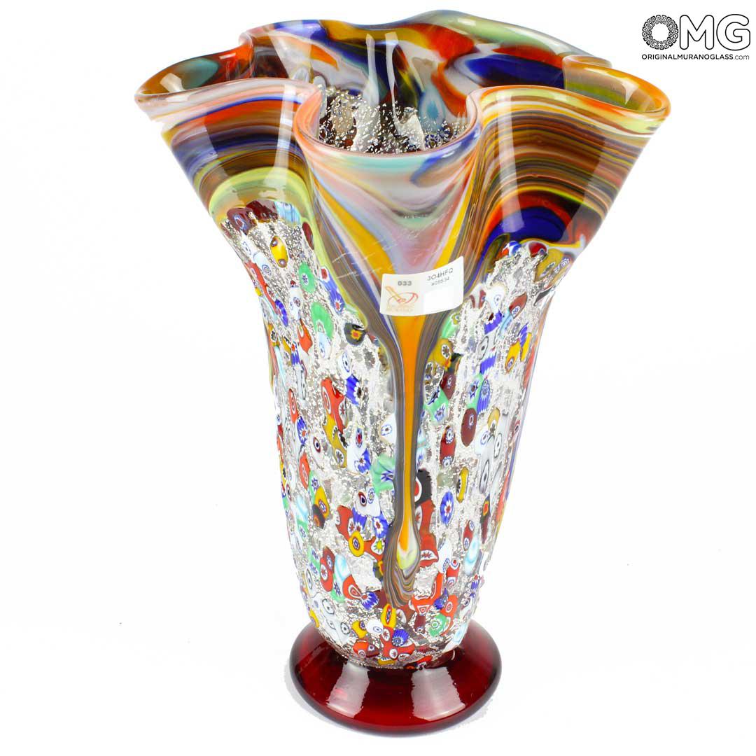 Vaso realizzato con la tecnica del vetro soffiato decoro in foglia d'argento e murrina. Opera firmata dal maestro e con il marchio Vetro Artistico® Murano applicato.