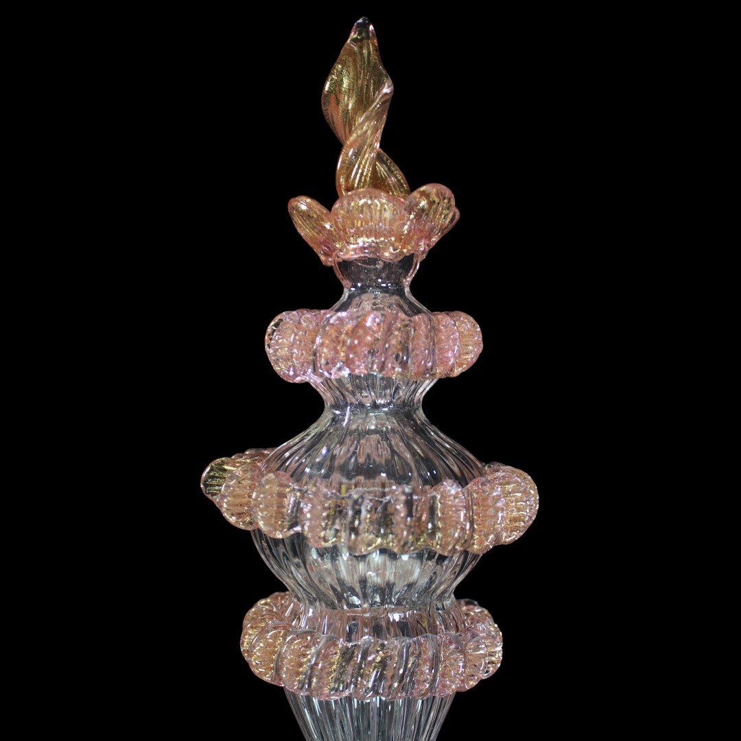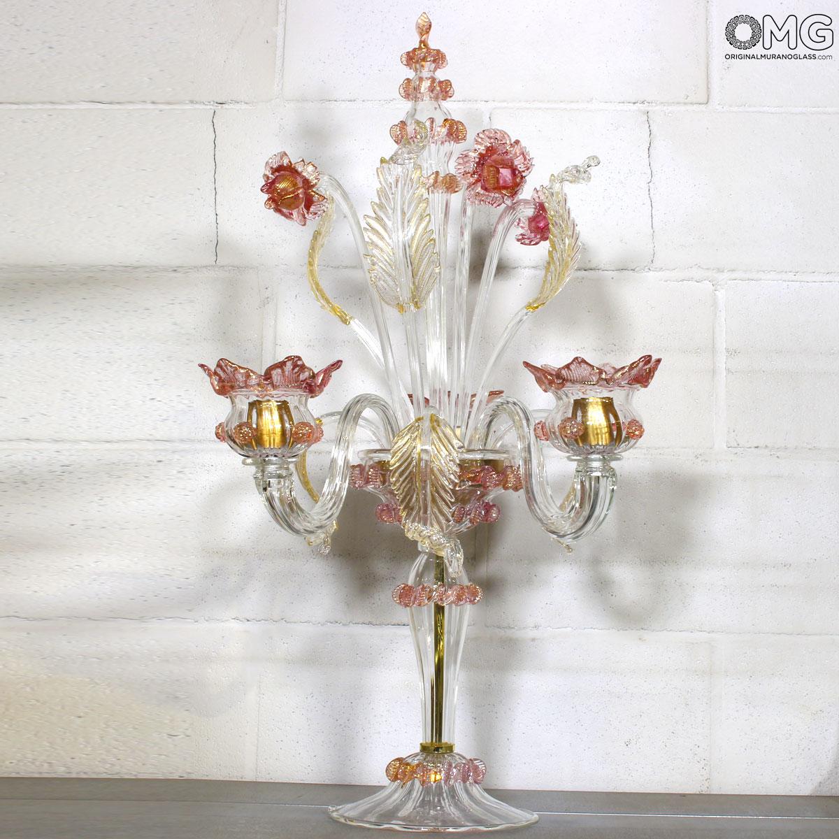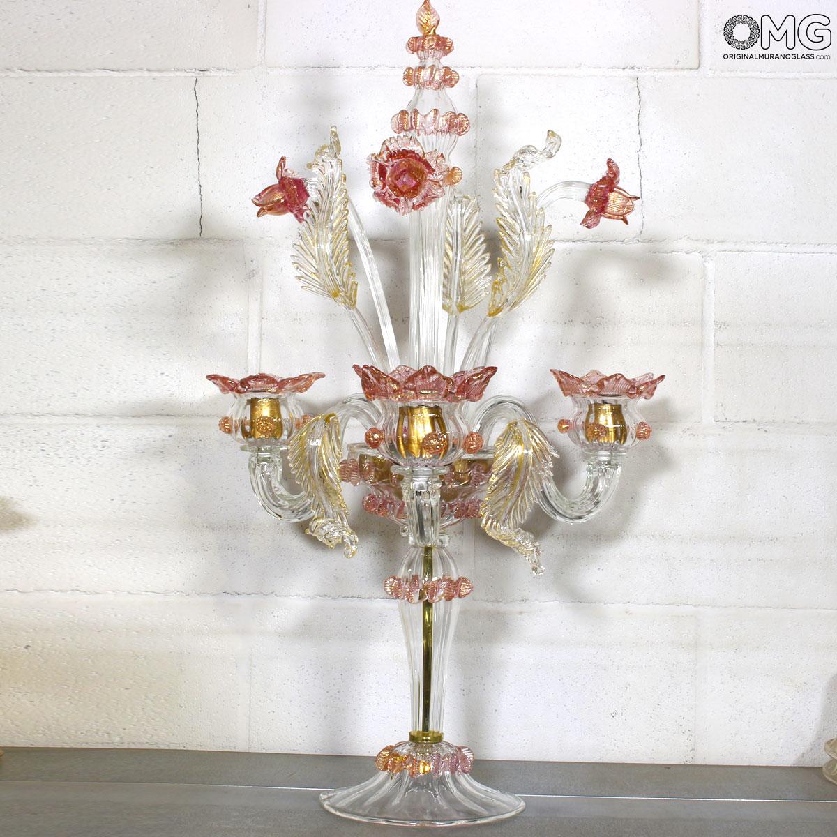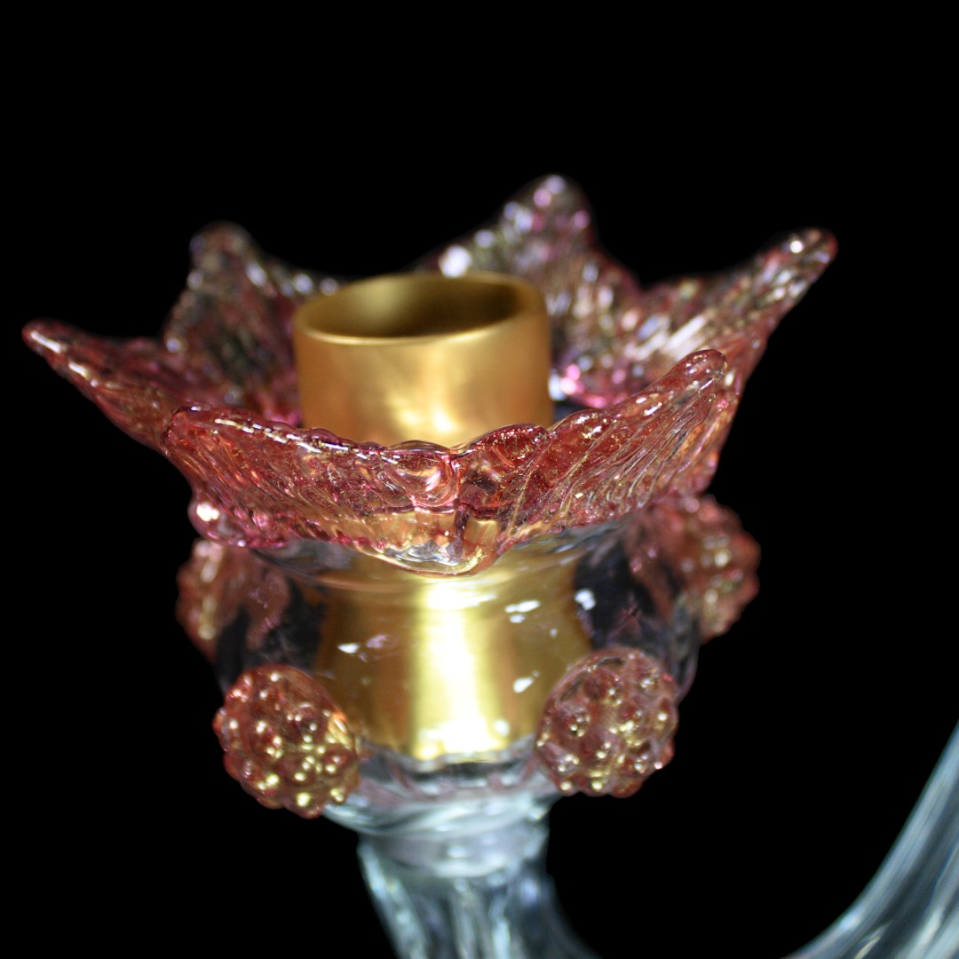 Flambeau a 3 luci, vetro veneziano trasparente con finiture rosa e oro. Flambeau fatto a mano secondo l'antica tradizione del vetro di Murano, realizzata artigianalmente in vetro soffiato. L'opera è disegnata secondo il famoso stile Veneziano,che arricchisce l'ambiente con eleganza. Pezzo di meravigliose caratteristiche di bellezza e di classe.