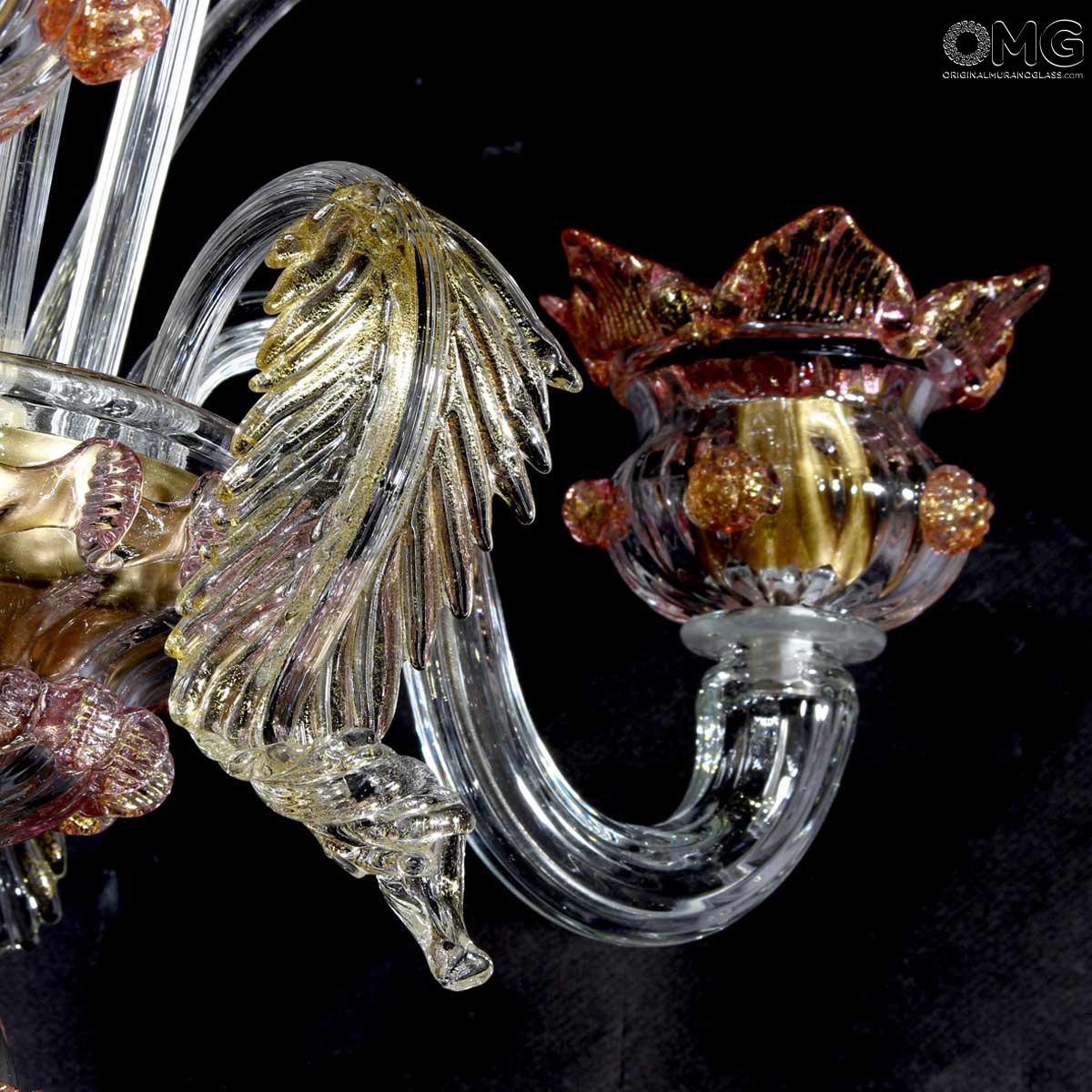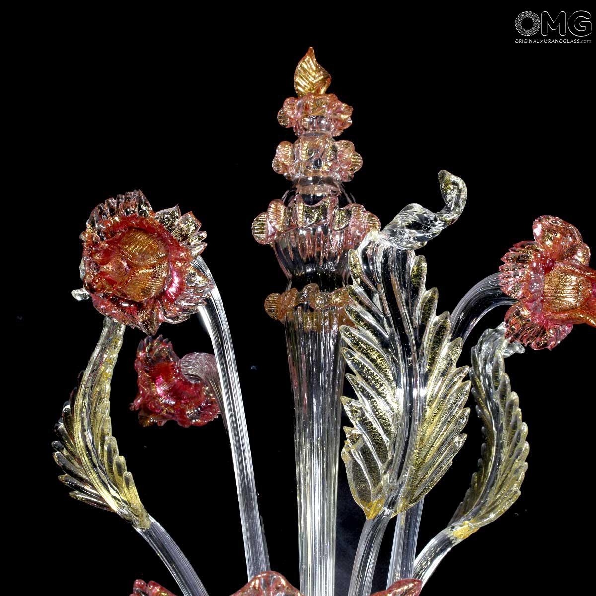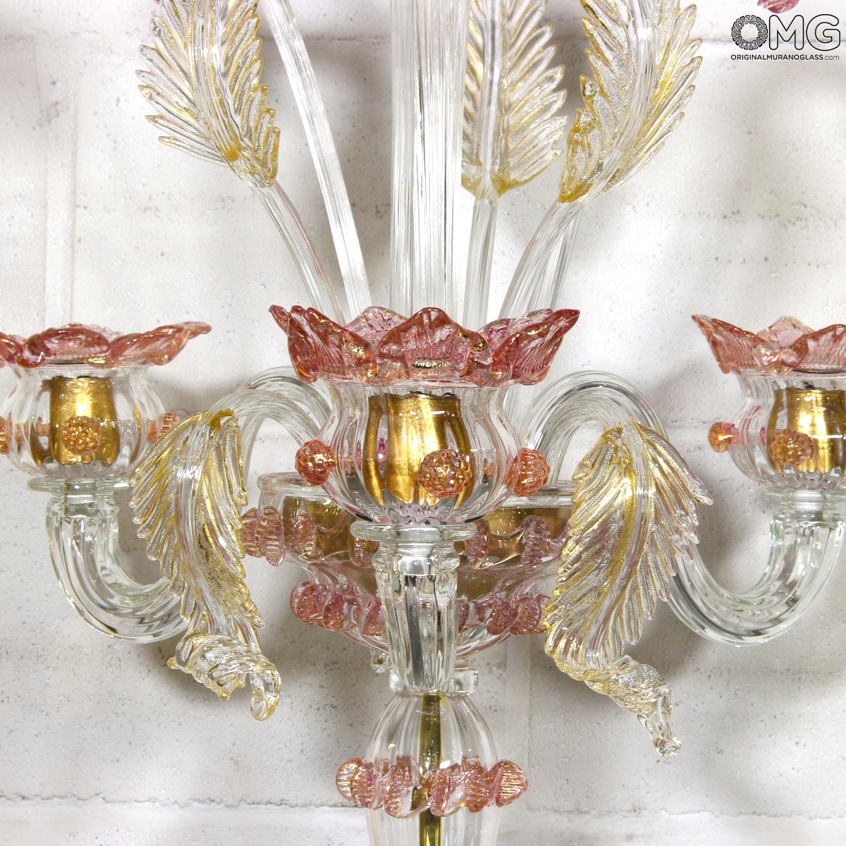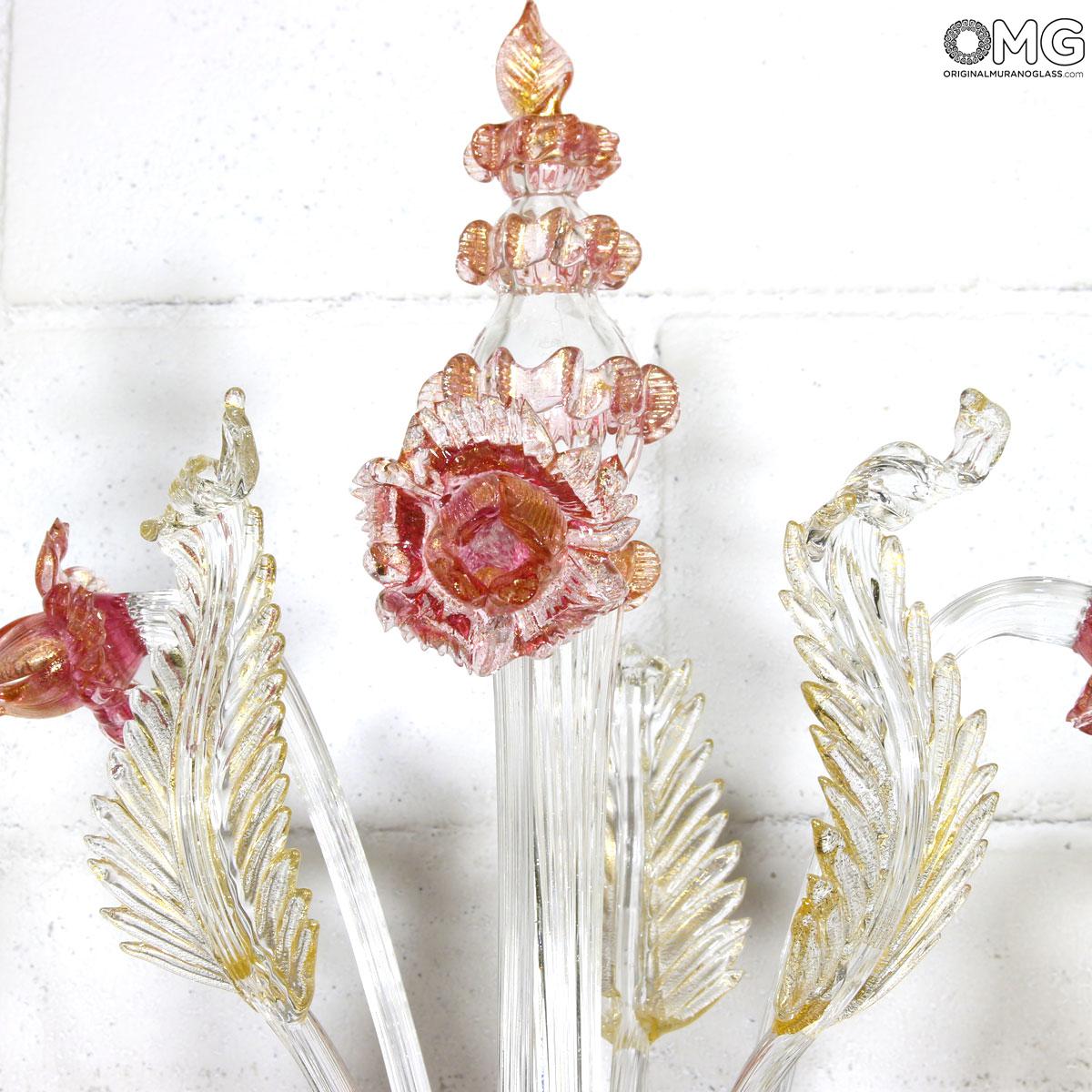 Flambeau a 3 luci, vetro veneziano trasparente con finiture rosa e oro. Flambeau fatto a mano secondo l'antica tradizione del vetro di Murano, realizzata artigianalmente in vetro soffiato. L'opera è disegnata secondo il famoso stile Veneziano,che arricchisce l'ambiente con eleganza. Pezzo di meravigliose caratteristiche di bellezza e di classe.