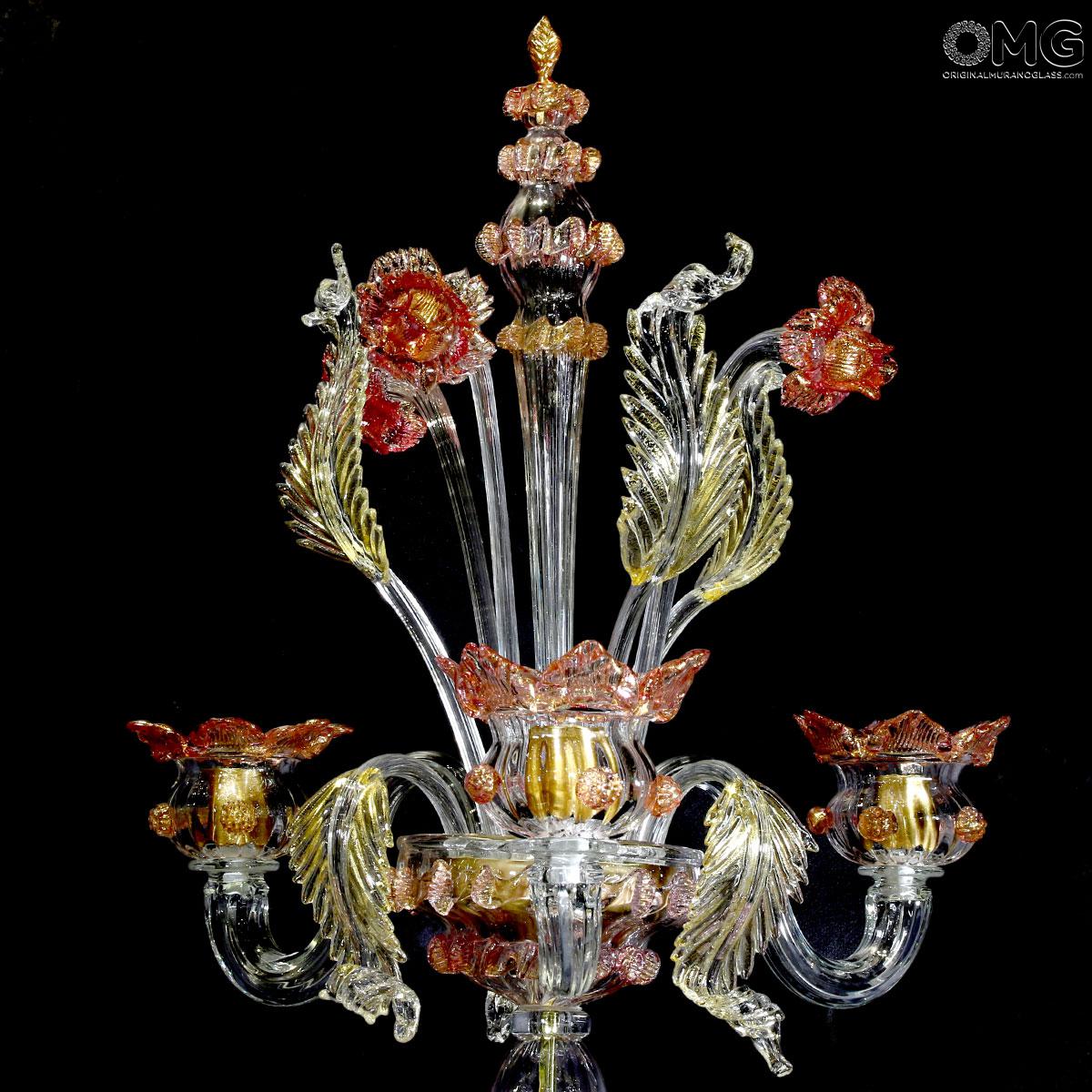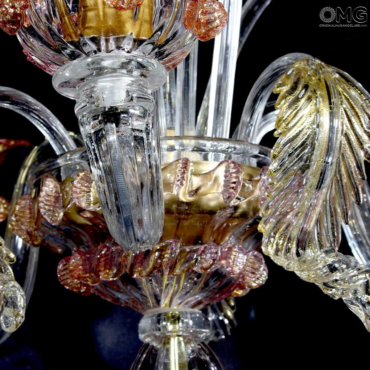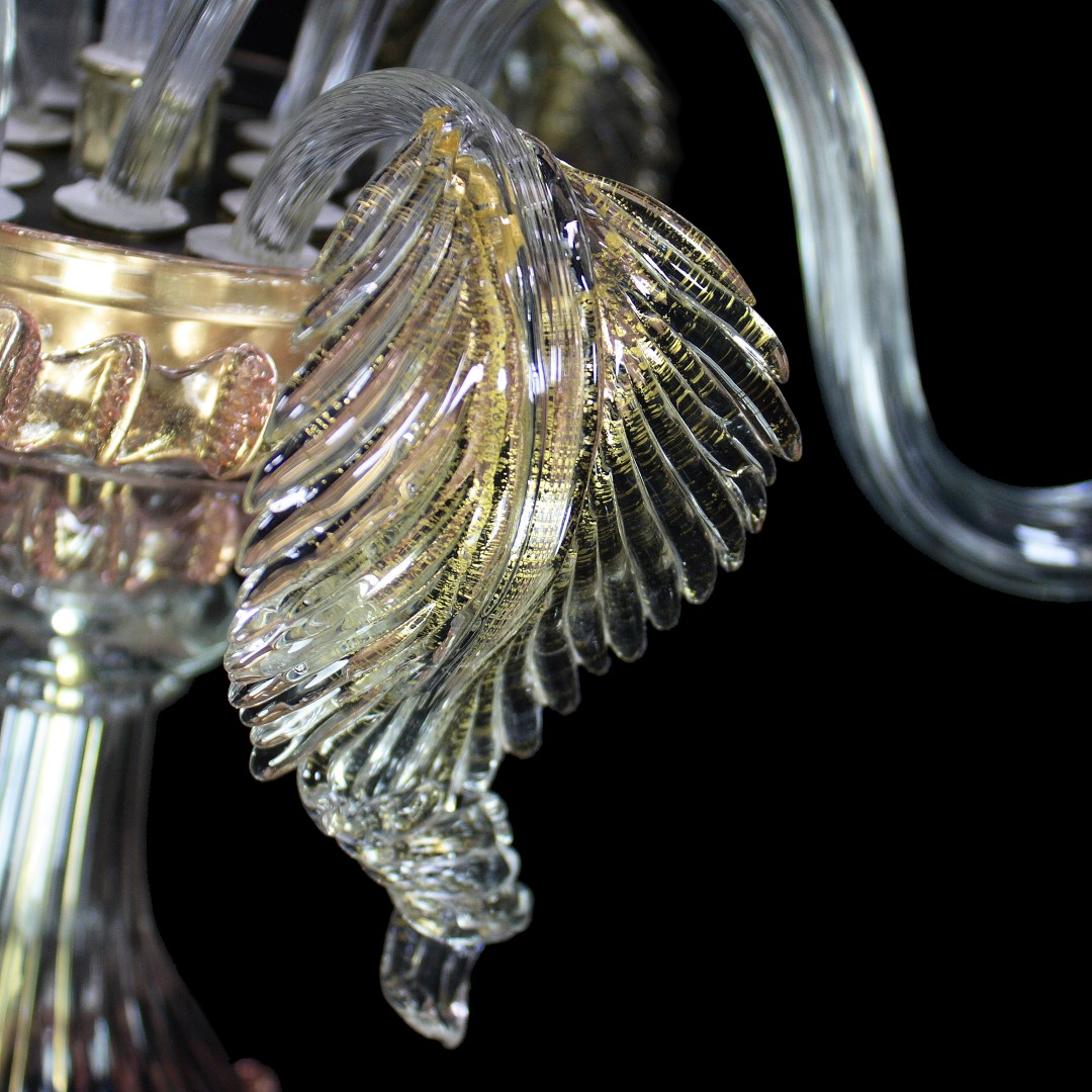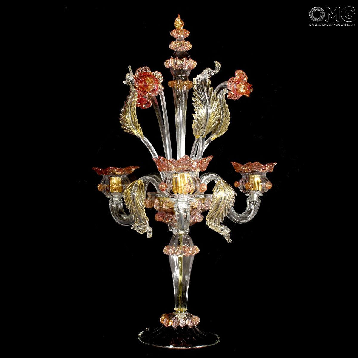 Flambeau a 3 luci, vetro veneziano trasparente con finiture rosa e oro. Flambeau fatto a mano secondo l'antica tradizione del vetro di Murano, realizzata artigianalmente in vetro soffiato. L'opera è disegnata secondo il famoso stile Veneziano,che arricchisce l'ambiente con eleganza. Pezzo di meravigliose caratteristiche di bellezza e di classe.