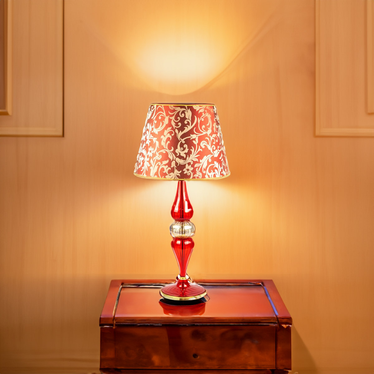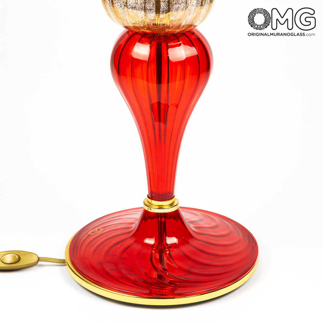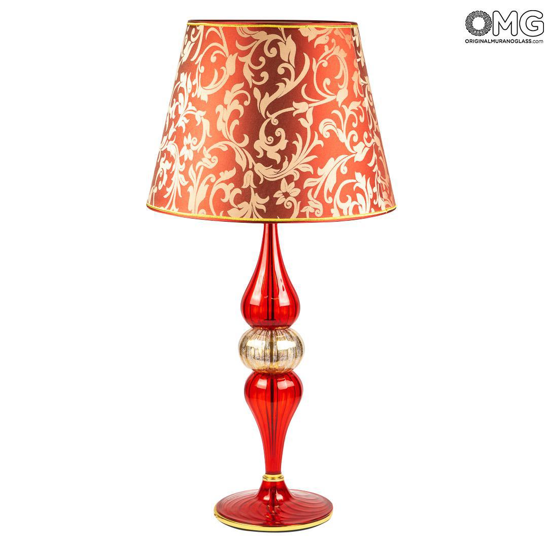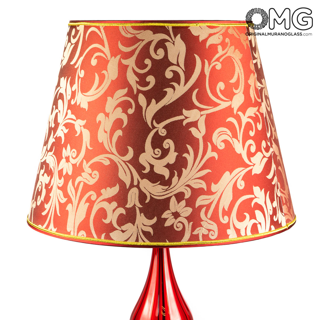 Lampada da tavolo in vetro soffiato color rosso, forma conica con decoro.