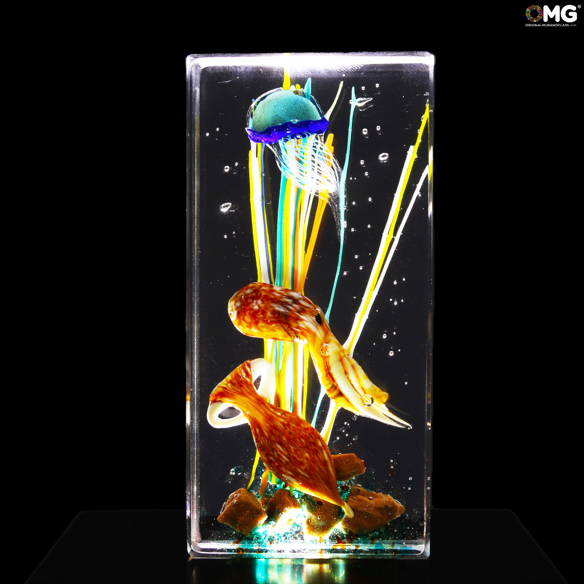 Scultura in vetro che raffigura un Acquario, realizzata con la tecnica del sommerso. Questa opera d'arte è realizzata a mano con una tecnica molto difficile da realizzare: prima il maestro vetraio crea separatamente i pesci e successivamente li fonde in uno strato di vetro ad alte temperature che assomiglia a un sasso. La scultura in vetro è firmata dal maestro vetraio.