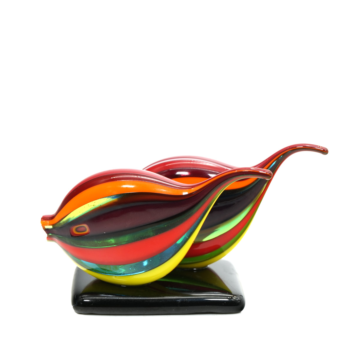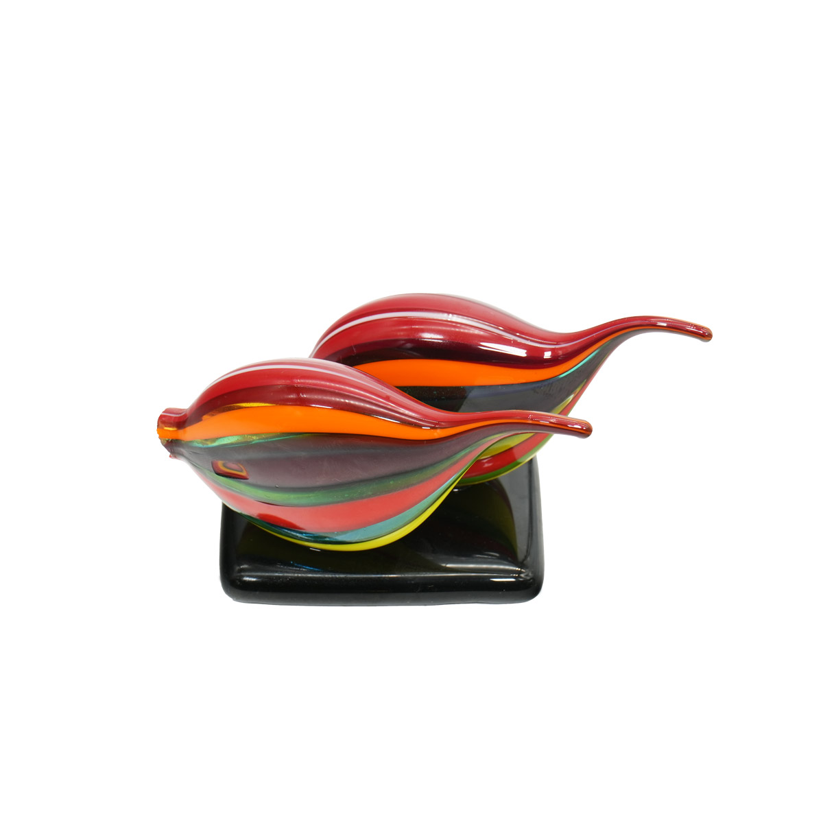 Scultura di due piccoli pesci in vetro su base. Questa opera d'arte è realizzata a mano sena l 'ausilio di stampi o forme.