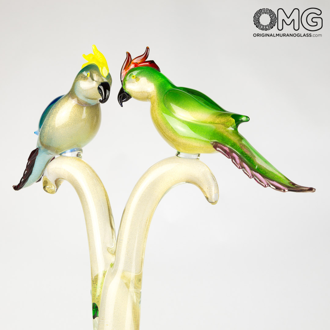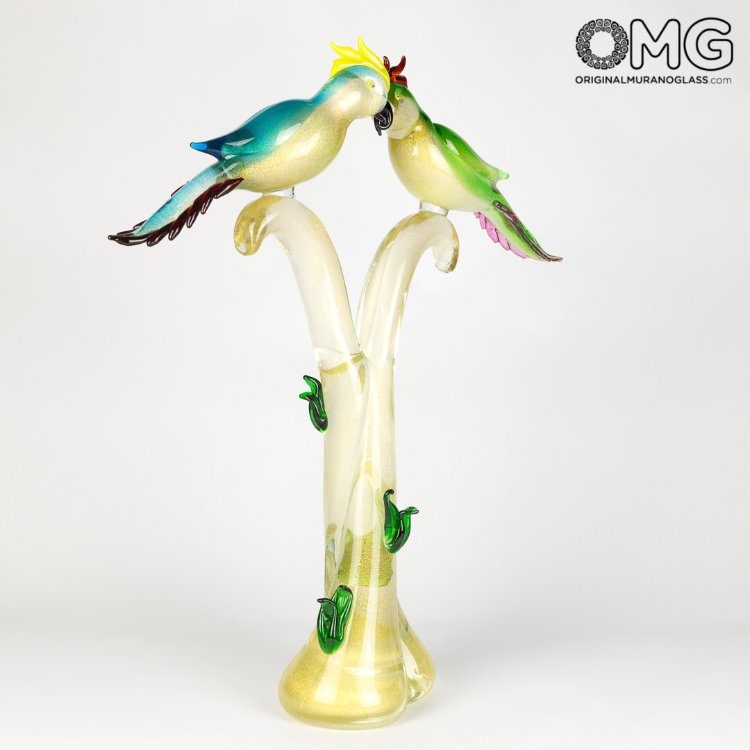 Scultura in vetro realizzata con oro 24 carati ed altri impreziosimenti in vetro colorato rappresentante due graziosi pappagalli su un ramo.