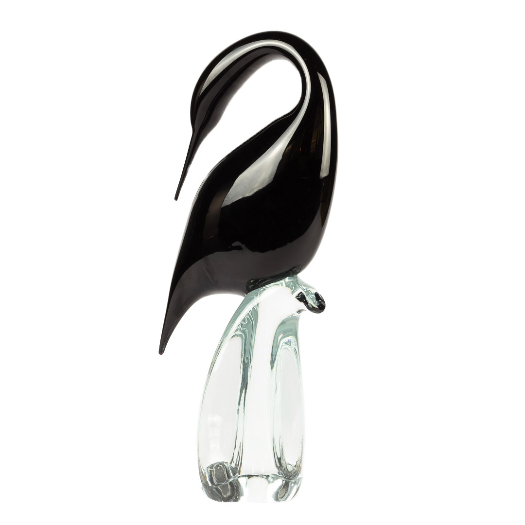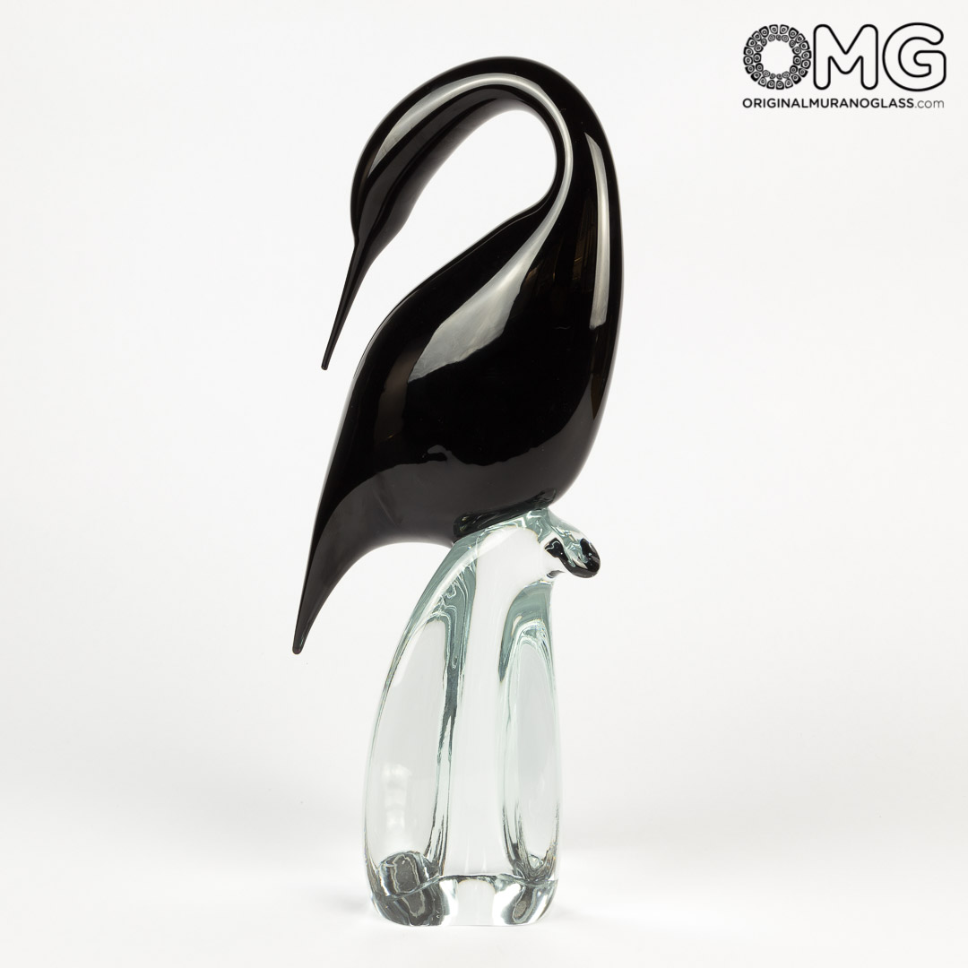 Sinuosa scultura di airone in nero su base di cristallo, lavorato a mano libera a puntello con le tecniche di lavorazione del vetro a Murano. Questa bella scultura, estremamente elegante, è l'opera d'arte perfetta per un ripiano di lusso o per completare il ricco mobilio della tua casa. Puoi metterla sotto la luce di una lampada, sul tavolo o in prossimità di una pianta. Ovunque la poni, questa elegante scultura ti regalerà tutto il suo fascino.