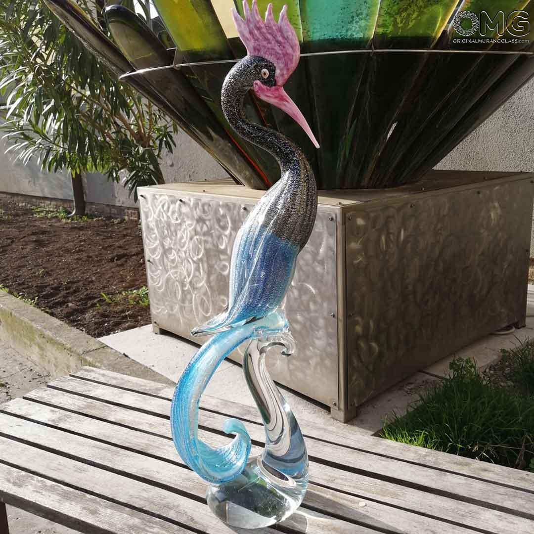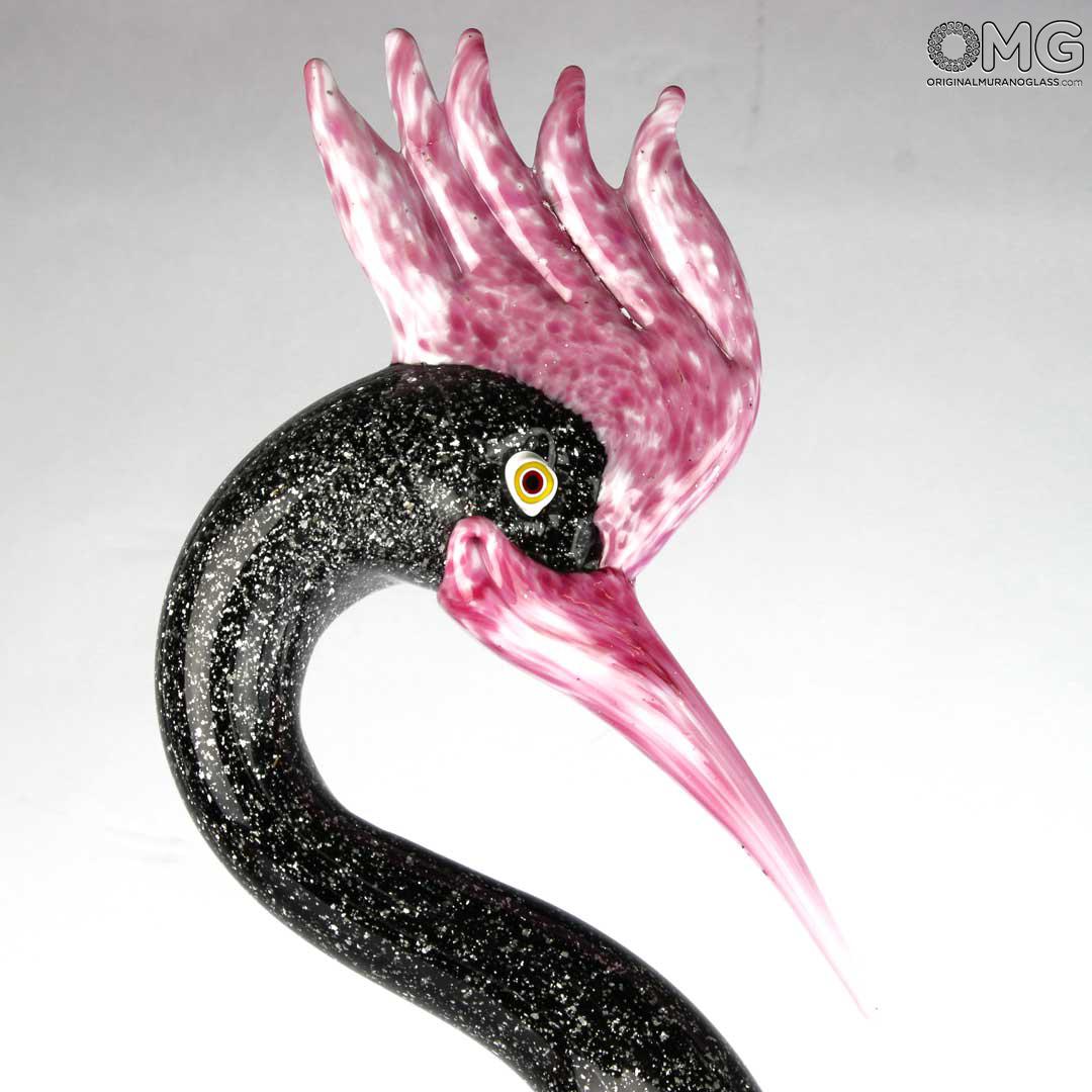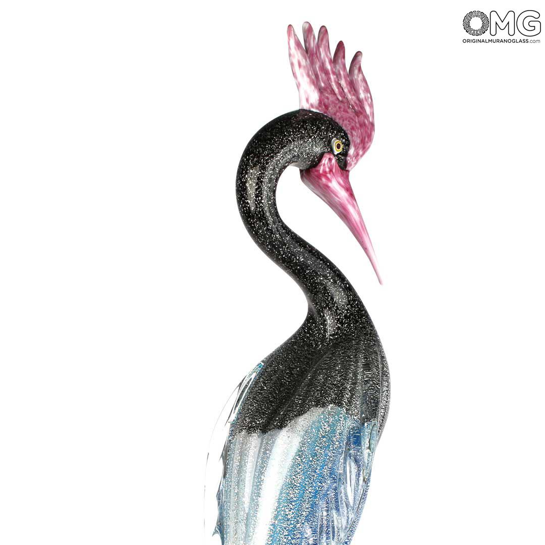 Sinuosa scultura di airone in nero e bianco su base di vetro nero, lavorato a mano libera a puntello con le tecniche di lavorazione del vetro a Murano. Questa bella scultura, estremamente elegante, è l'opera d'arte perfetta per un ripiano di lusso o per completare il ricco mobilio della tua casa. Puoi metterla sotto la luce di una lampada, sul tavolo o in prossimità di una pianta. Ovunque la poni, questa elegante scultura ti regalerà tutto il suo fascino.