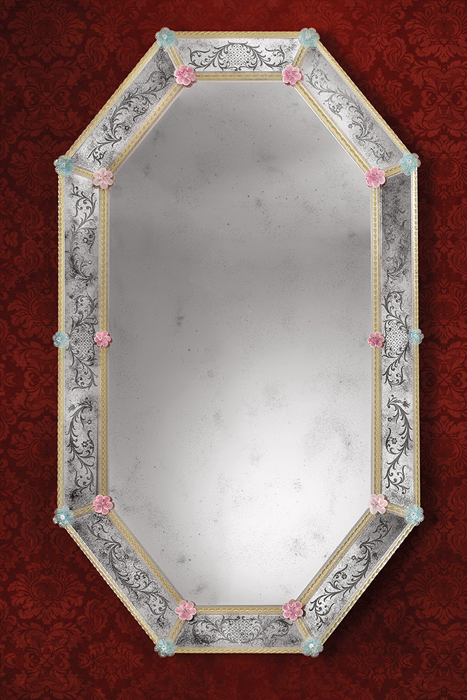 L'opera d'arte è disegnata e realizzata con cura nei dettagli dai nostri artigiani specchieri, dai maestri vetrai per gli abbellimenti in vetro di Murano, e falegnami.