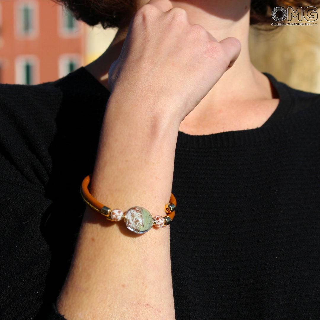 Beads are made in glass molten and embellished with different colors and submerged avventurina, while the strap is in leather, so this bracelet is a perfect jewels for the woman who need something for a special events or is looking for something to dress in every moment of the day.