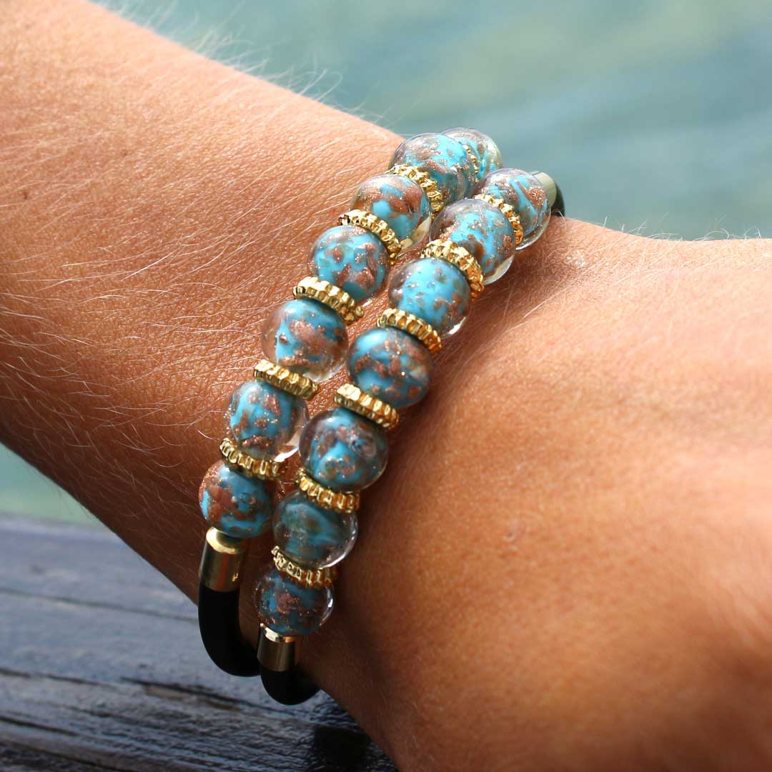 Each bead is handcrafted individually from molten Murano glass and embellished with different shades of light blue and sparkling avventurina. The double-strand design makes this Murano glass bracelet a perfect piece of jewelry for every occasion, whether you need something refined for an elegant event or stylish for everyday wear.
