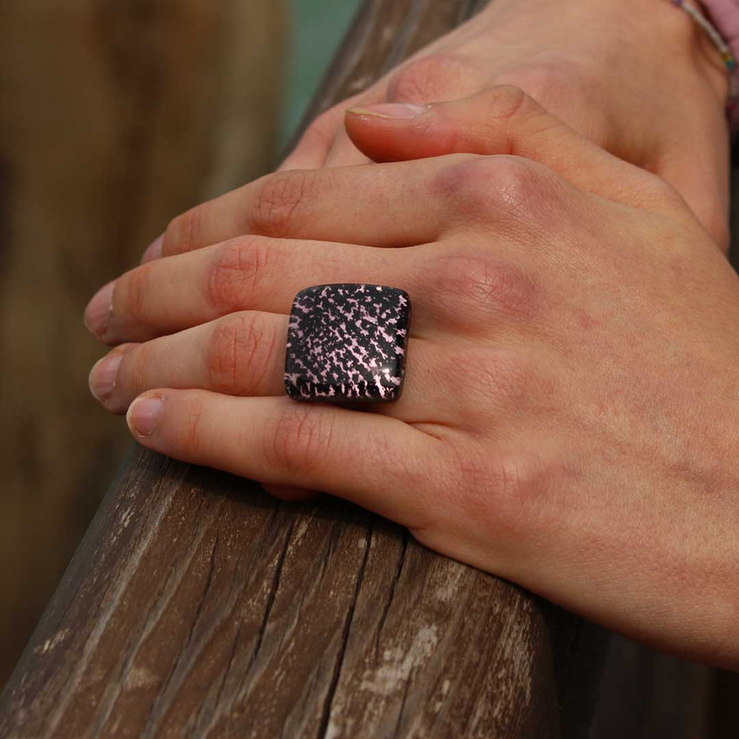 Glass ring made with hot modeling technique and engraved silver leaf. Handmade in Murano glass.
