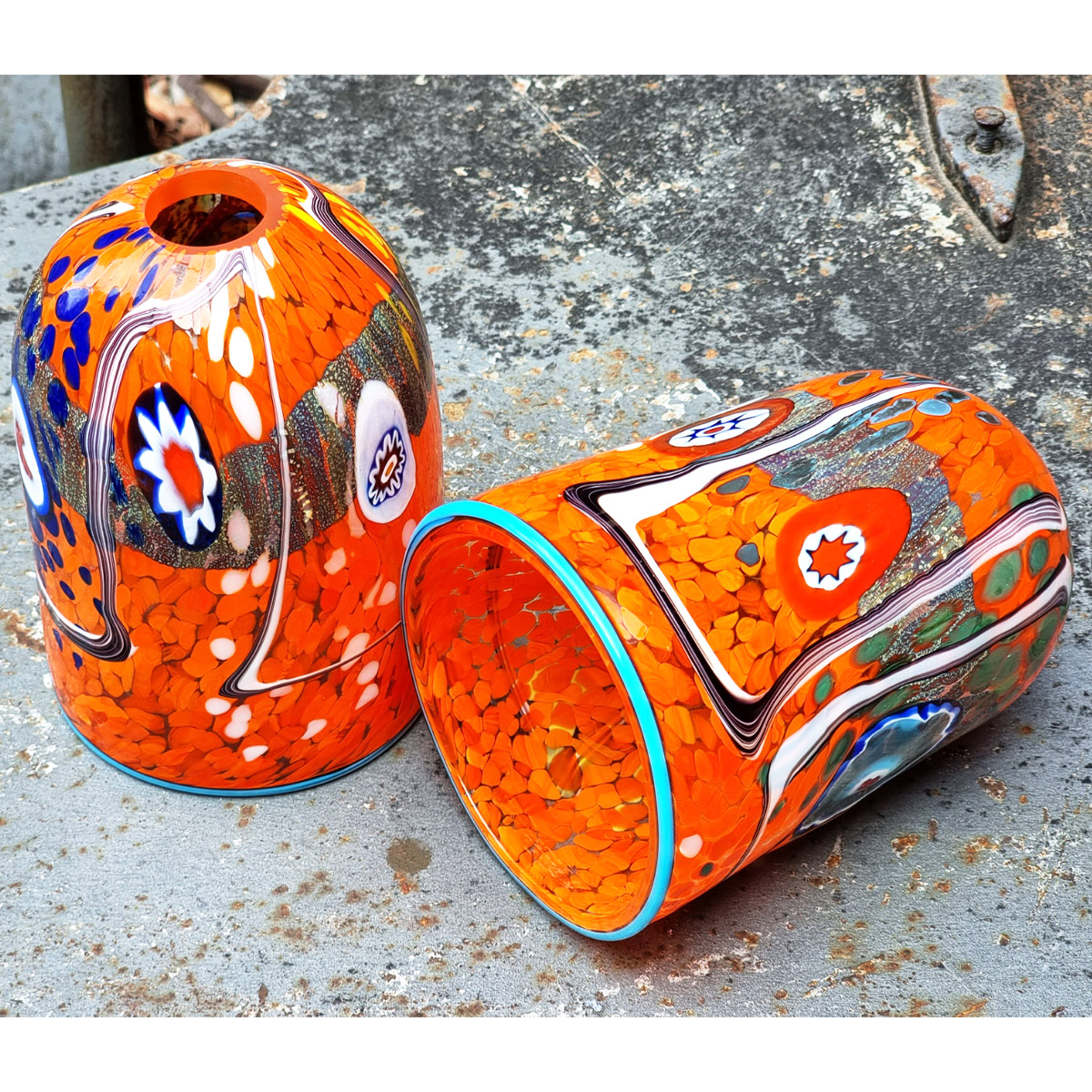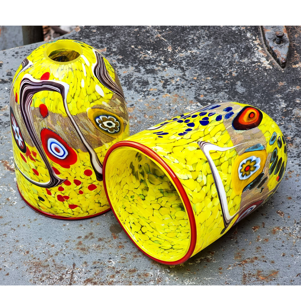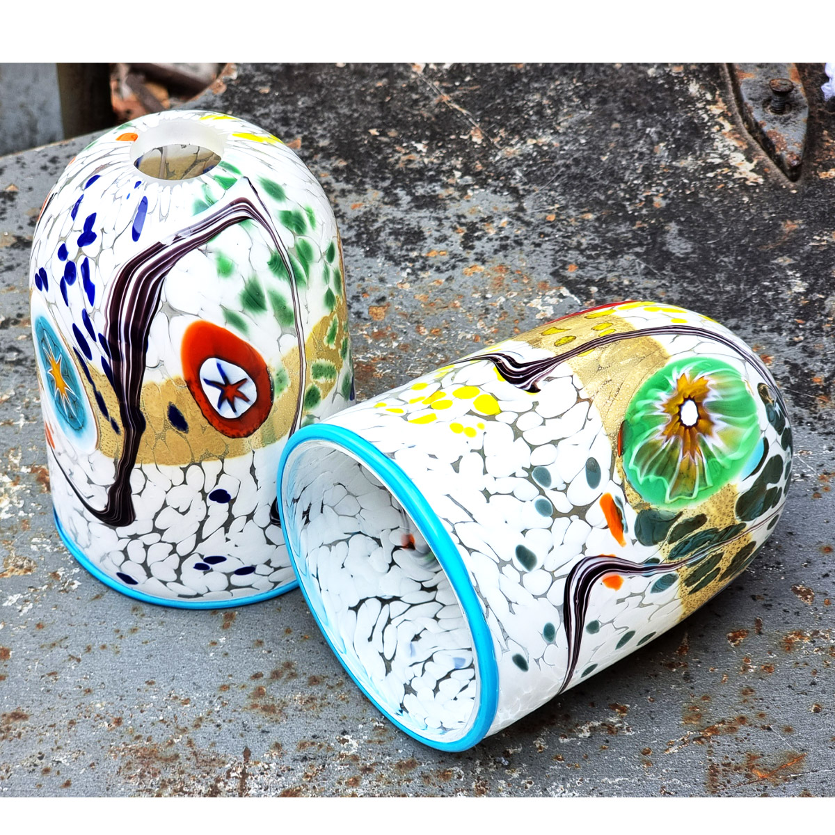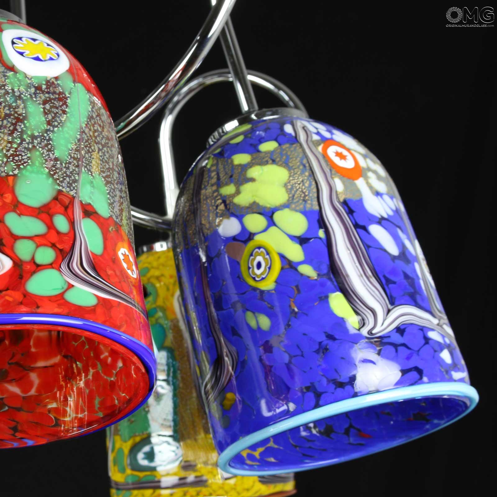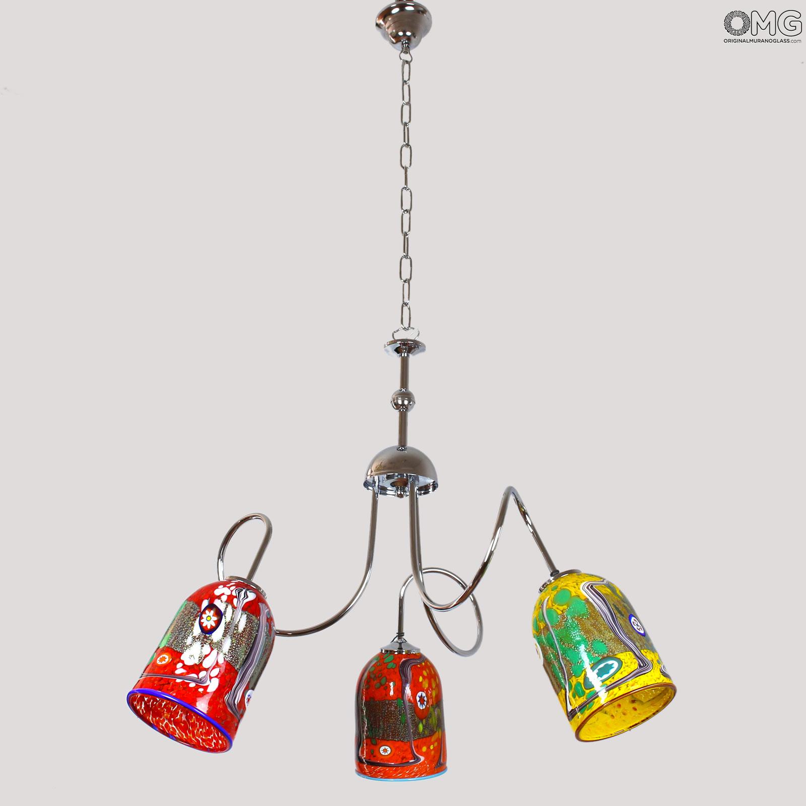 Original Murano Glass hanging lamp handmade in original venetian glass, with 3 cups holder in artistic glass with millefiori murrine and canes. The cup is very elegant and colorful. This Murano glass light will enrich your room space with unique light colors.