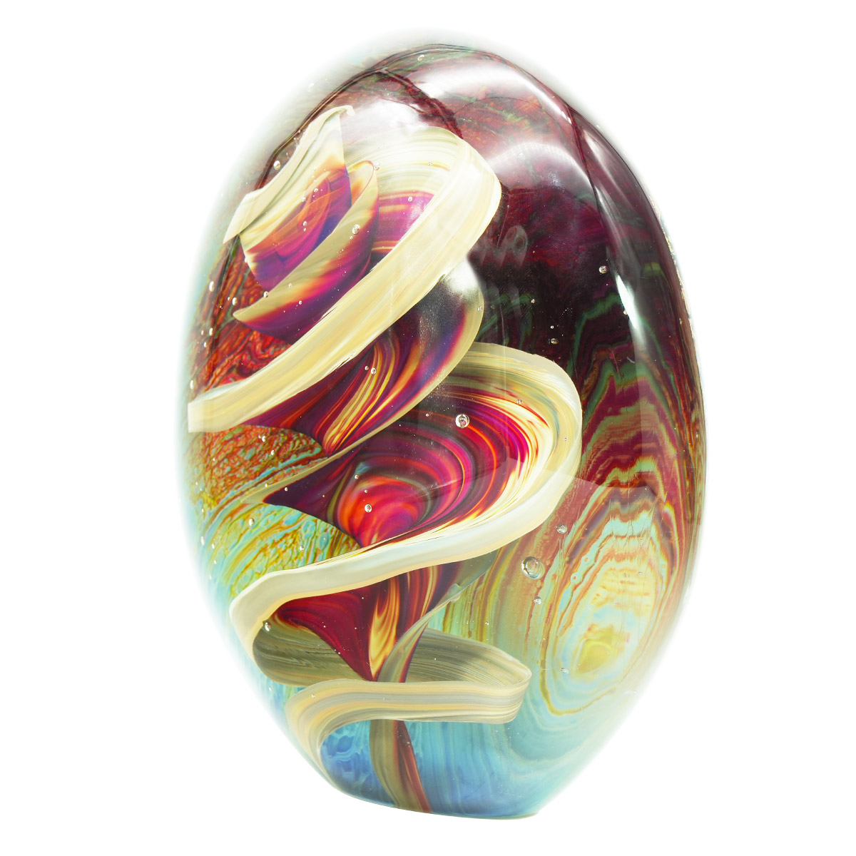 Clear and chalcedony glass artwork of an egg, worked free hand on a punty in solid glass. Ground and polished by hand.