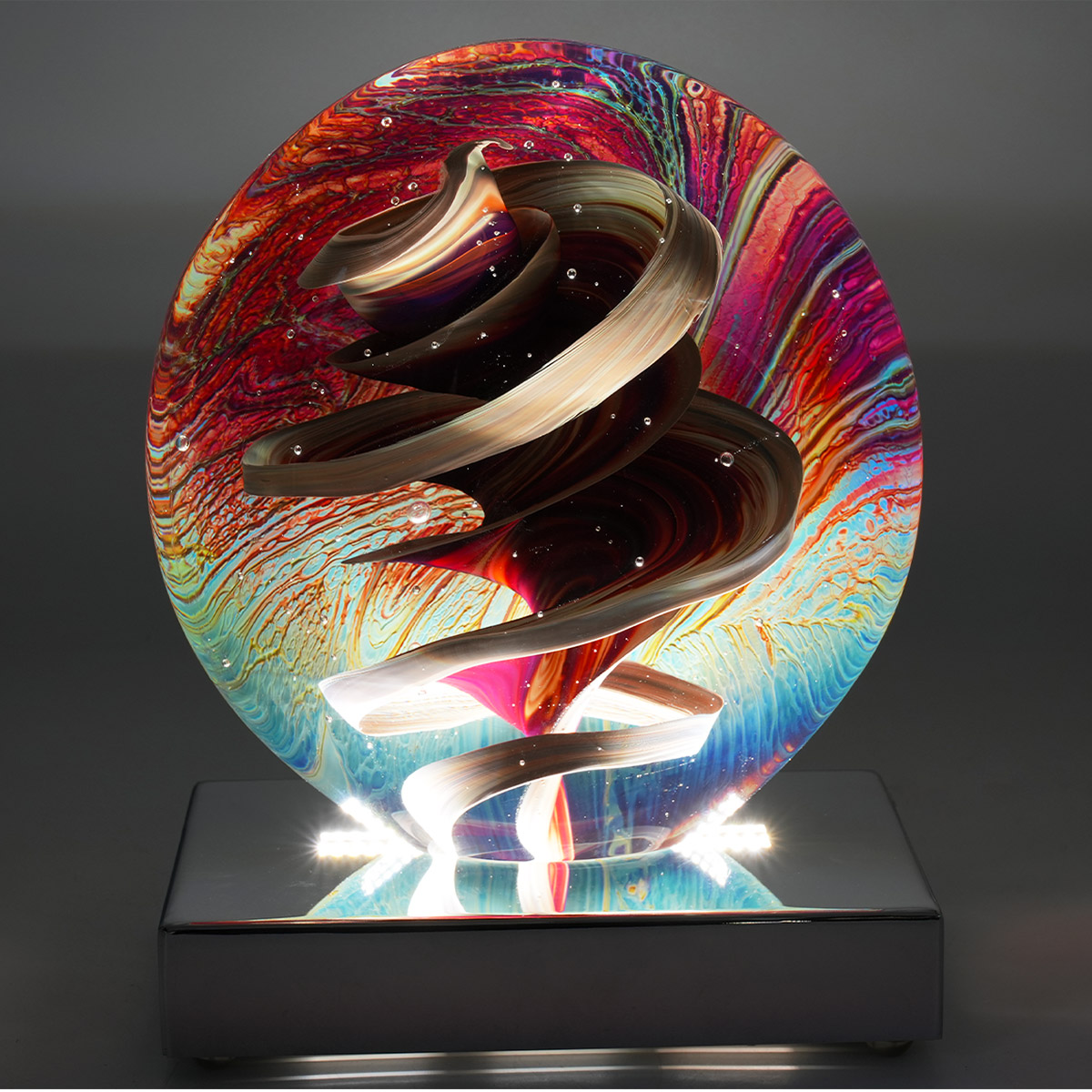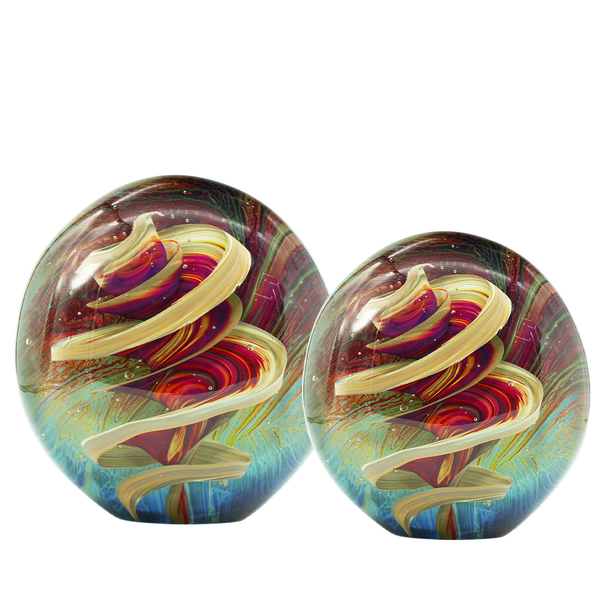 Particularly difficult to realize, chalcedony glass has the peculiarity of joining the canonical glass sphere with silver salts and other coloring oxides: this extraordinary chemical process, coupled with the talent of the Masters of Murano, allows the creation of wonderful works in which an opaque background is streaked with enchanting warm and dark shades, a real turbine of lights and shadows capable of ravishing even the eyes of the most experienced observer.