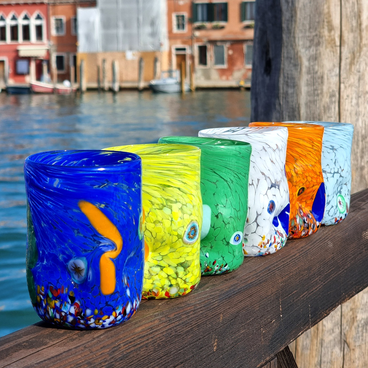 Cool set of 6 Murano glasses with murrine millefiore and multicolor glass rods. Perfect for every day use for drink water, wine, cocktails, coke and aperitive, to impress your guests.